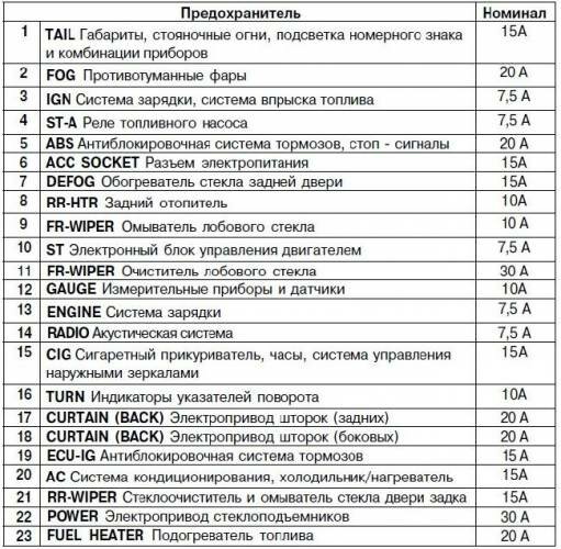 Обозначение предохранителей и реле в монтажном блоке в моторном отсеке