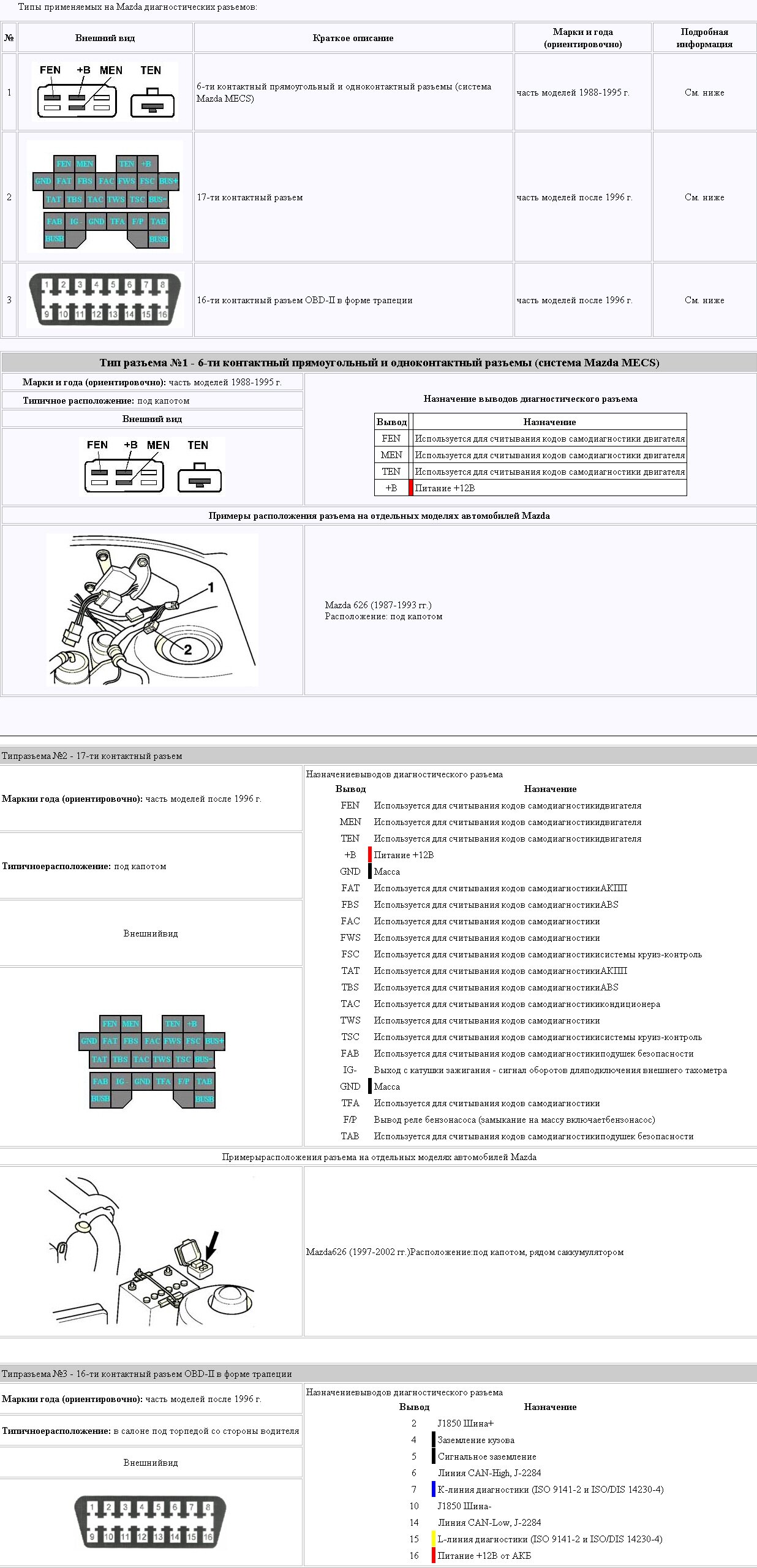 Показаны три различные схемы диагностических разъемов для автомобиля MAZDA, в том числе стандартный для многих авто 16 контактный разъем OBD-II. Также указано их расположение в авто и видео примера работы устройства. Информация предоставляется бесплатно для самостоятельной диагностики автомобилей Мазда и не предназначена для коммерческого использования. В качестве устройства для считывания информации, можно применить специальный L- или K-LINE адаптер.