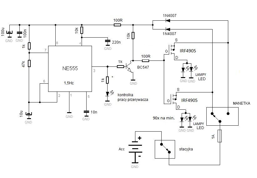 Сам прерыватель включает в себя защиту по току, генератор импульсов, управление генератором и полупроводниковый исполнительный элемент. В нем естественно нет механических элементов типа реле. Максимальная нагрузка по току составляет 1 А при стандартном напряжении 13,5 - 14,5 В (напряжение от генератора). При потреблении большого тока срабатывает защита по току. Случайная смена полярности при подключении не повредит системе. В режиме покоя прерыватель не потребляет тока совсем. Включение указателей поворота выполняет прерыватель. Сразу после включения поворотников, они горят. Потом мигают с частотой 2 Гц, то есть 120 раз в минуту.