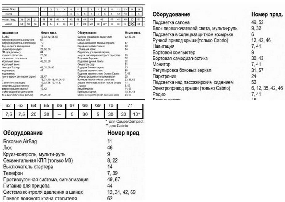 № предохранителя Защищаемая цепь (ru | de) Сила тока, А
