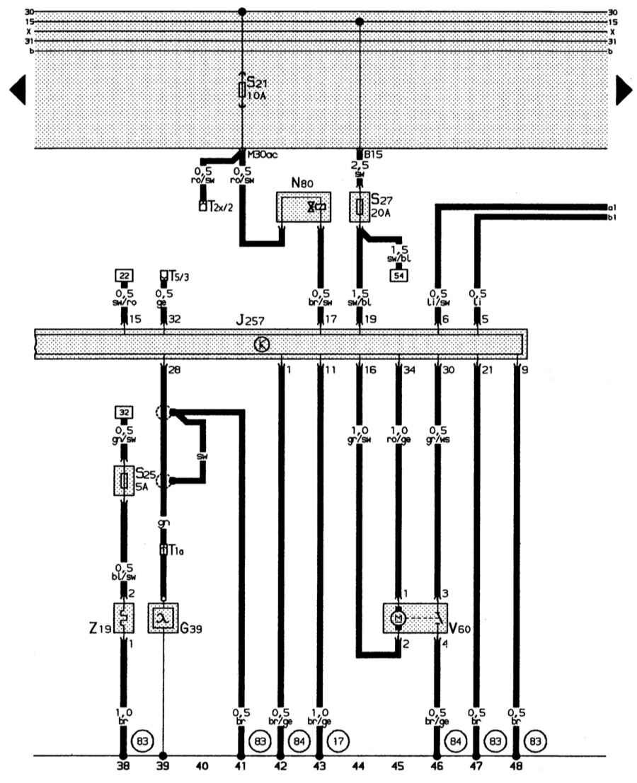 Лямбда-зонд с подогревом, электромагнитный клапан бачка с активированным углем, регулятор положения дроссельной заслонки. Цвета проводов: br – к, br/ge – к/ж, bl/sw – сн/ч, gn/sw – з/ч, sw – ч, gr/sw ср/ч, ro/ge – кр/ж, gr/ws ср/б, sw/ro – ч/кр, ge – ж, br/sw – к/ч, sw/bl – ч/сн, li/sw – л/ч, li – л, ro/sw кр/ч.