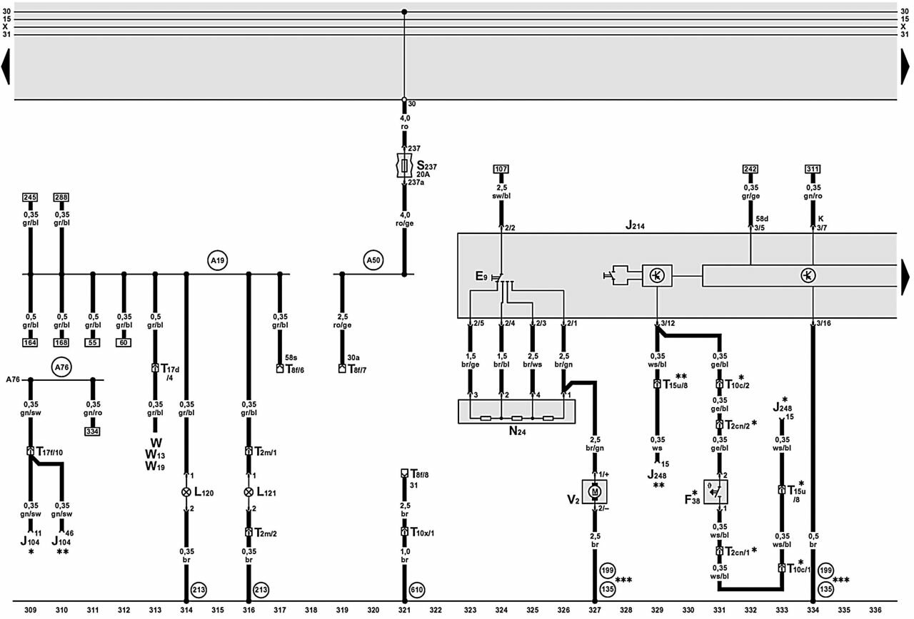 T3bg – 3-контактный электрический разъем, в блоке Е, под водозащитным кожухом (под лобовым стеклом)