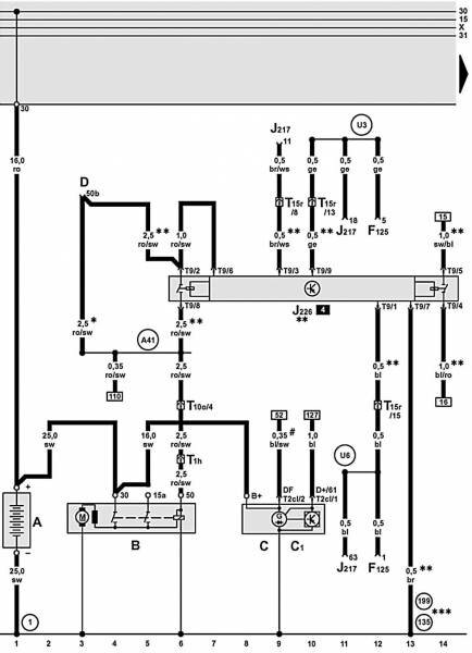 Продолжение описания электрооборудования авто AUDI A6. Ниже приводятся схемы и обозначение элементов на электросхемах. Для увеличения - кликните на схему. Источник - сайт по принципиальным схемам Ауди.
