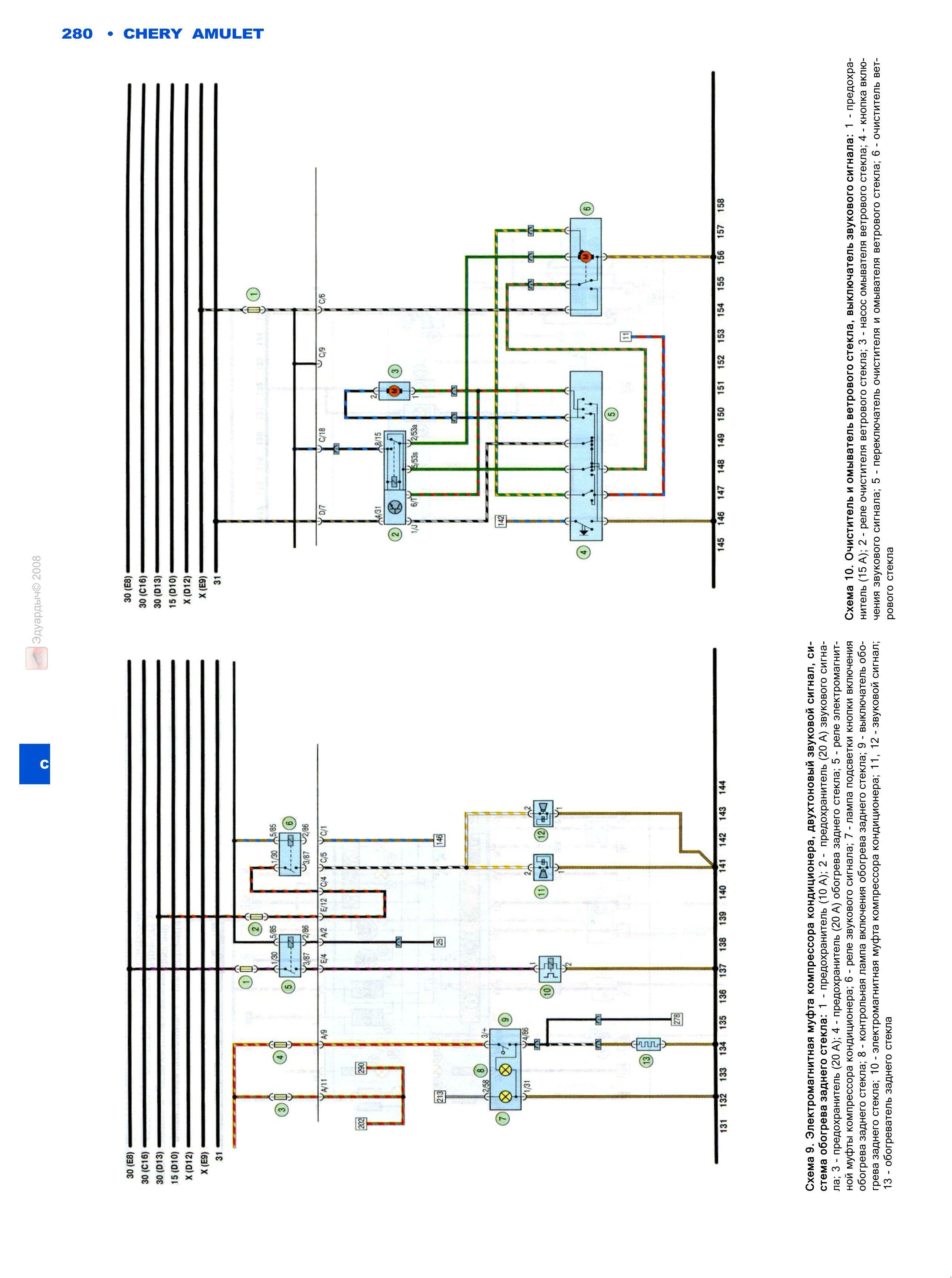 Очиститель и омыватель лобового стекла, выключатель звукового сигнала, электромагнитная муфта компрессора кондиционера, двухтоновый звуковой сигнал, система обогрева заднего стекла - схема на Chery Amulet