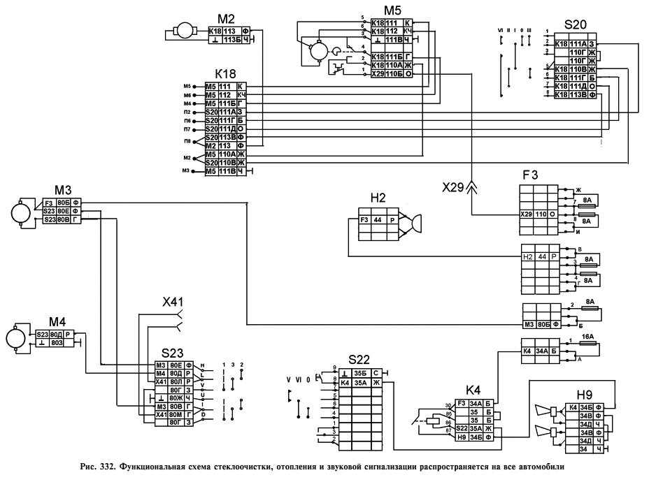 Схема стеклоочистки, отопления и звуковой сигнализации