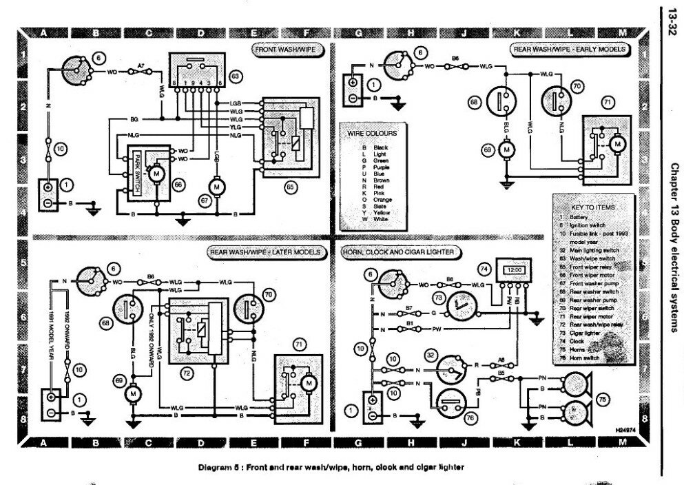 Приведены схемы электрооборудования автомобиля Land Rover Discovery I 1993 года выпуска. Схемы чёрно-белые в не очень хорошем качестве, но этого достаточно для самостоятельного небольшого ремонта неисправностей электрической части авто. Все обозначения на английском языке - воспользуйтесь любым переводчиком.