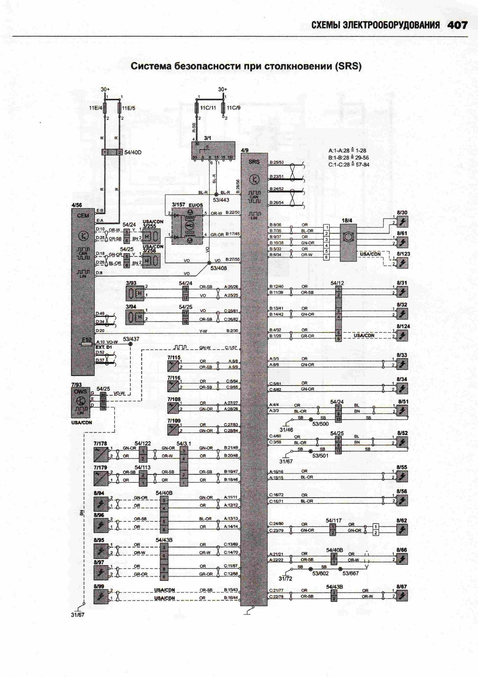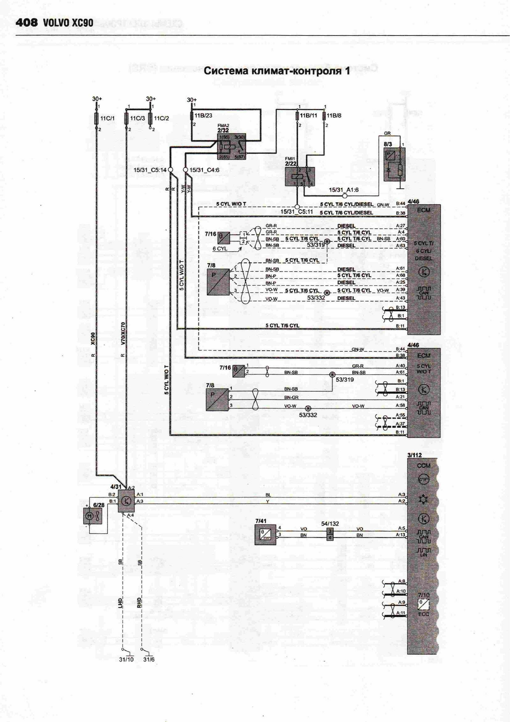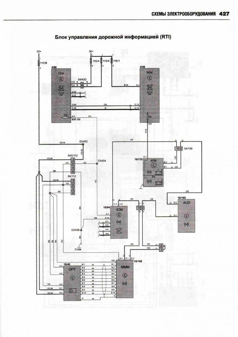 Принципиальные схемы электрооборудования автомобиля ВОЛЬВО ХС 90 с 2002 (двигатели типов бензин 2,5, 2,9, 3,2, 4,4 л и дизель 2,4). Начало сборника схем данного авто находится здесь. А тут вы можете посмотреть схемы фар и блока предохранителей. В Volvo 90 были разработаны активные биксеноновые фары, способные следовать направлению поворота автомобиля. Такие фары значительно повышают видимость в темное время. Процессор получает данные о различных параметрах движения автомобиля, проводит их анализ и настраивает систему для оптимального освещения дороги. Фары могут поворачиваться под углом до 15 градусов в каждом направлении, таким образом, общий диапазон поворота составляет 30 градусов. Это позволяет лучше и дальше освещать дорогу. Во избежание износа системы в дневное время функция поворота фар автоматически отключается. Ещё предлагается установка камеры для облегчения парковки. Это устройство, цель которого предотвратить наезд на людей при движении задним ходом и облегчить процесс парковки. Камера с большим углом охвата показывает зону сзади автомобиля. Причем система не только позволяет водителю видеть, что происходит сзади автомобиля, но она еще показывает планируемую траекторию движения задним ходом. Изображение выводится на экран навигационной системы, размещенный поверх панели приборов. Угол поля изображения охватывает всю зону за автомобилем, при этом обеспечивается минимальное искажение изображения. На экран выводятся вспомогательные линии, которыми обозначен периметр предполагаемой парковки после завершения требуемых маневров. Эти линии изменяются в зависимости от вращения рулевого колеса, помогая водителю сделать правильный выбор. Камера полностью интегрирована с системами авто.
