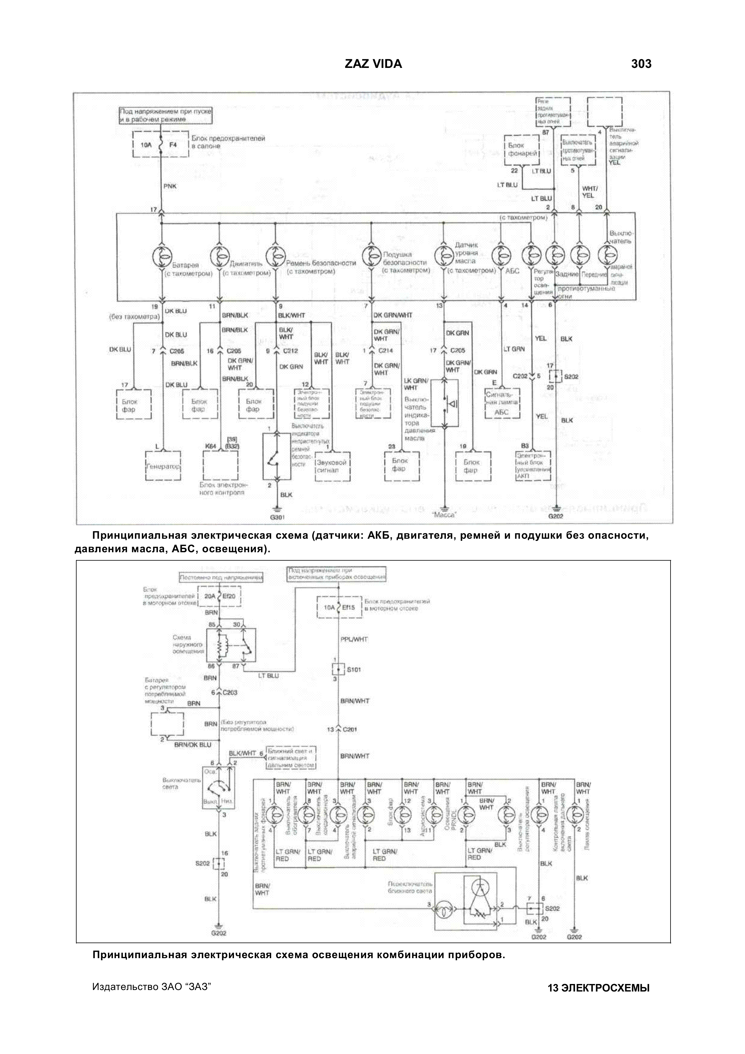 Сборник качественных схем автомобиля Zaz Vida взятых из инструкции по ремонту и эксплуатации. Имеются описания предохранителей,элементов схем и цвета проводников в электропроводке авто Заз Вида. Для увеличения - кликните на схеме.