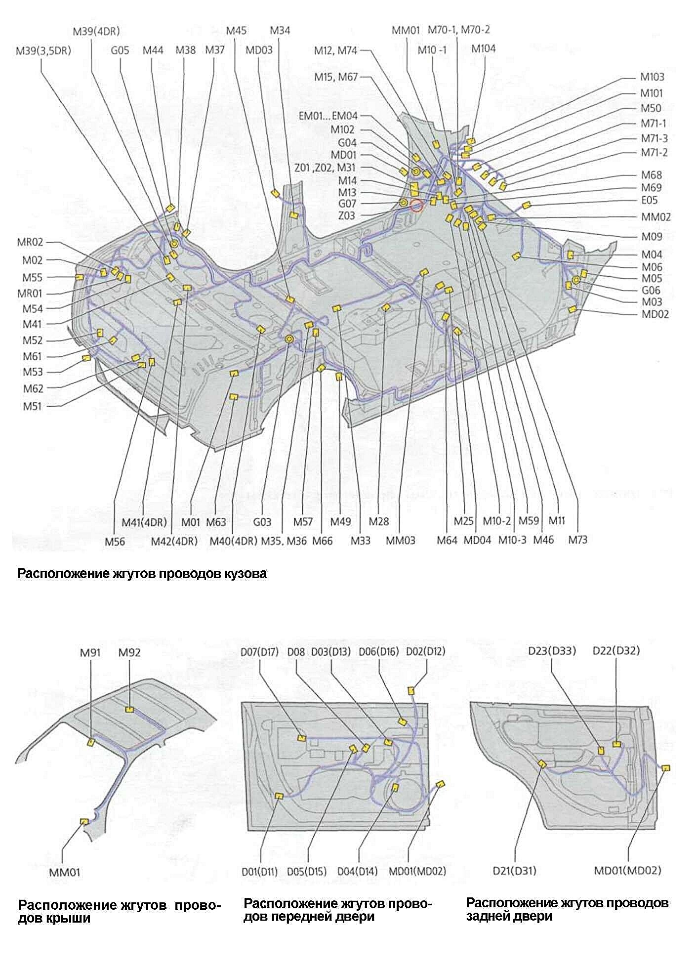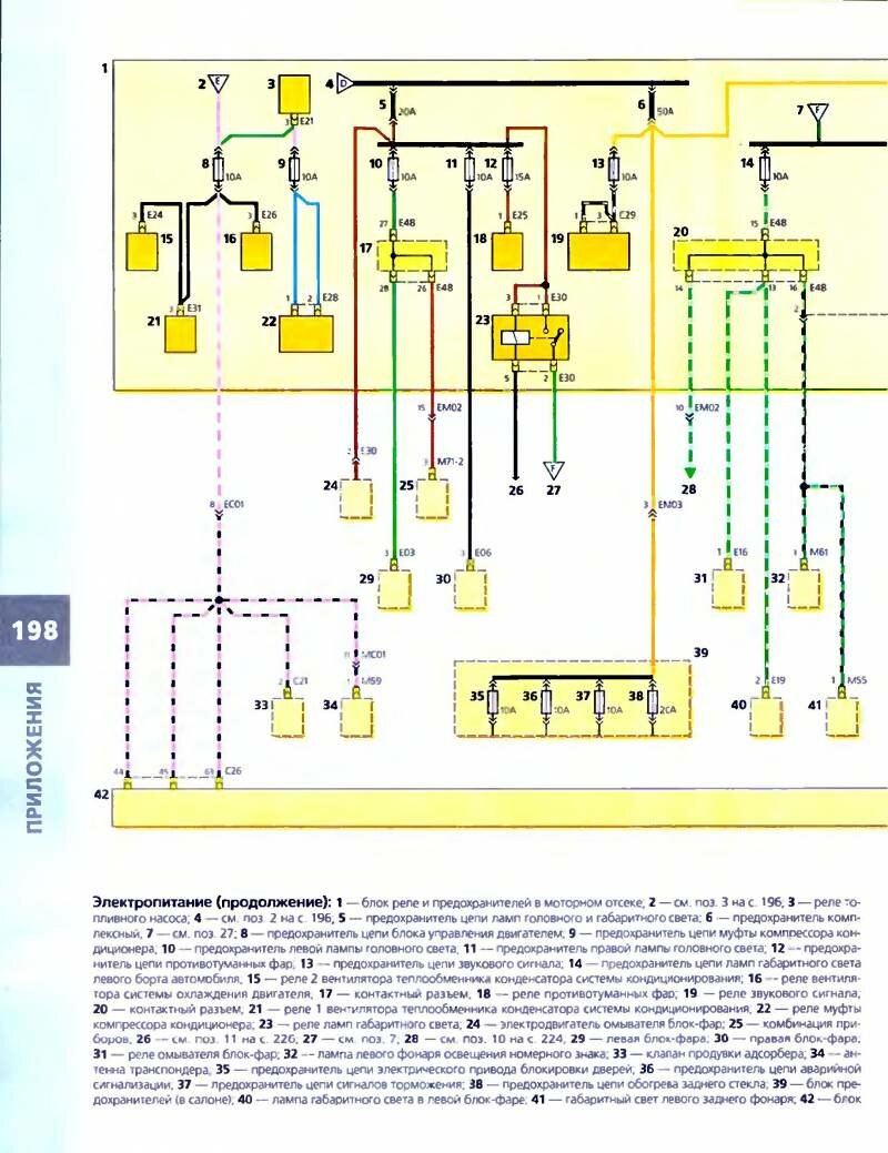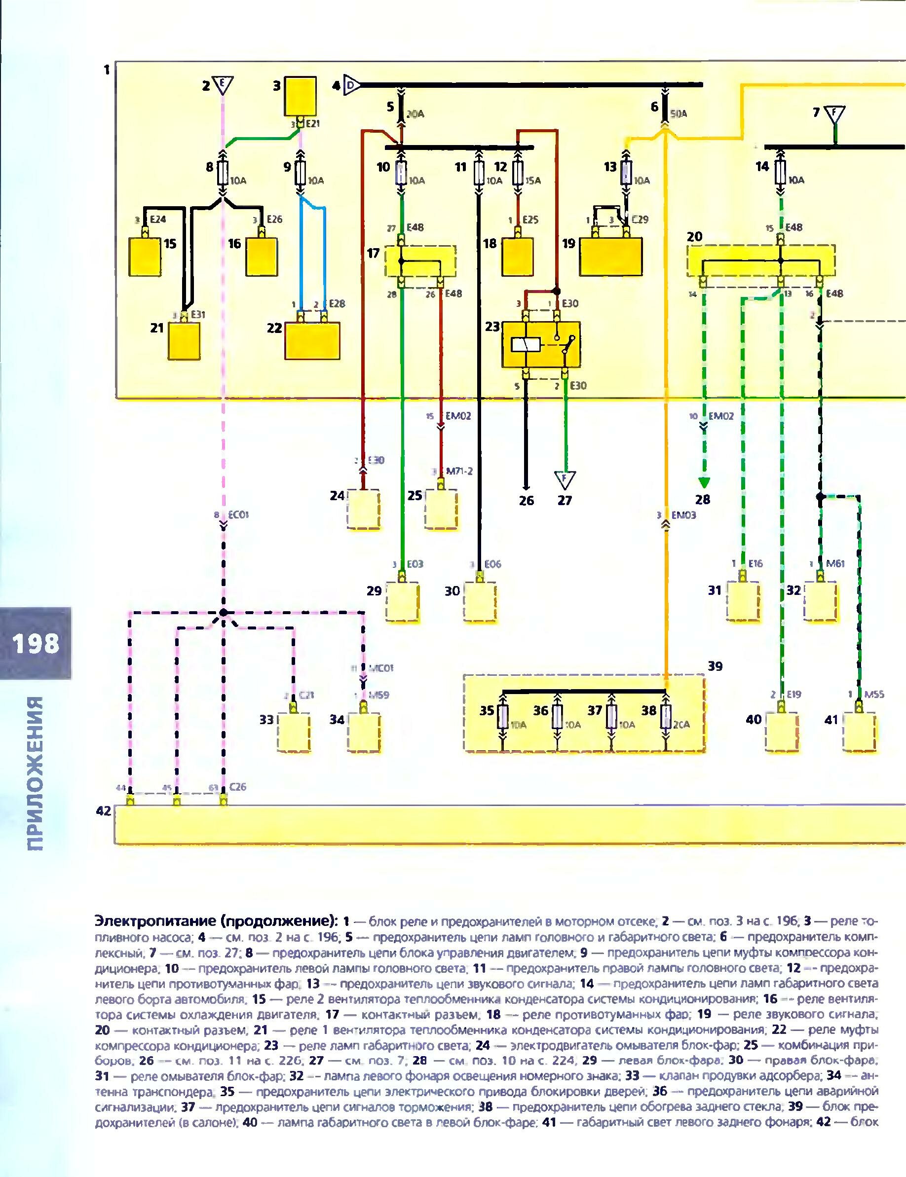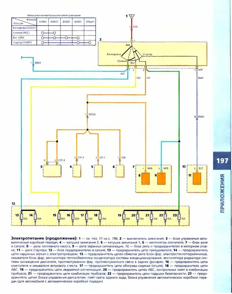 Бесплатный сборник цветных схем на русском языке электрооборудования автомобиля Hyundai Accent (1,5i) с 2000 года выпуска. Тут показан блок реле и предохранителей, а также некоторые другие модули. Продолжение каталога схем читайте далее. Предохранители служат для того, чтобы разрывать цепь, когда сила тока достигнет определенного значения, для того, чтобы защитить элементы и провода, которые могут быть повреждены слишком сильным током. Резкое увеличение силы тока обычно вызвано неисправностью в цепи, чаще всего коротким замыканием. Обозначения цепей, защищаемых предохранителями, указаны на крышке блока предохранителей.