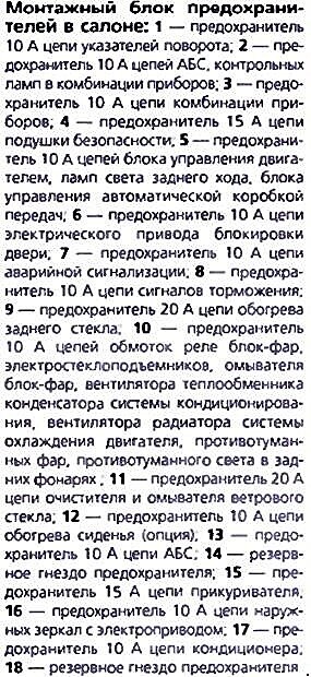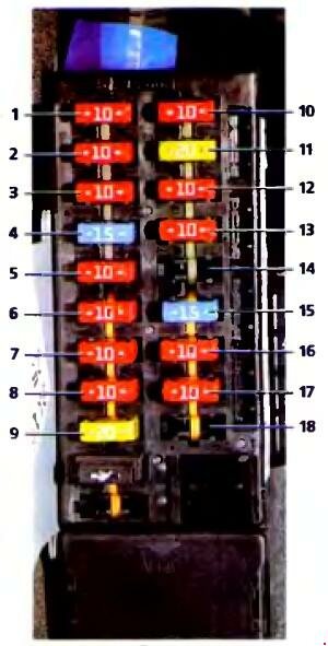 Перед снятием предохранителя выключите соответствующую цепь, затем достаньте предохранитель из контактов. Внутри предохранителя должен быть виден провод; если предохранитель перегорел, провод будет порван или расплавлен. Всегда используйте предохранители требуемой мощности. Никогда не используйте предохранитель другой мощности и не заменяйте его чем–нибудь другим. Не заменяйте предохранитель более одного раза, не устранив источник неисправности. Ток, защищаемый предохранителем, указан сверху на предохранителе: обратите внимание, что предохранители имеют различные цвета для облегчения идентификации. Если предохранитель перегорает сразу после замены, не заменяйте его снова, пока не установите и не устраните причину неисправности. В большинстве случаев причиной неисправности является короткое замыкание, вызванное плохой изоляцией. Если предохранитель защищает несколько цепей, постарайтесь отыскать цепь, из–за которой перегорает предохранитель, включая каждую из цепей по очереди (если возможно). Всегда имейте в автомобиле комплект запасных предохранителей различной мощности. Они должны быть закреплены у основания блока предохранителей.