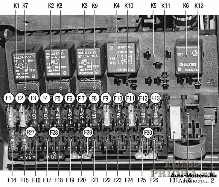 F2 (синий) 60 блок управления электропакетом, электровентилятор двигателя, обогрев заднего стекла, реле разгрузки выключателя зажигания