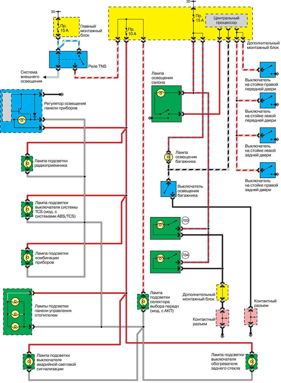 Л34 – лампочка освещения на левом козырьке Л35 – лампочка освещения порожка левой передней двери