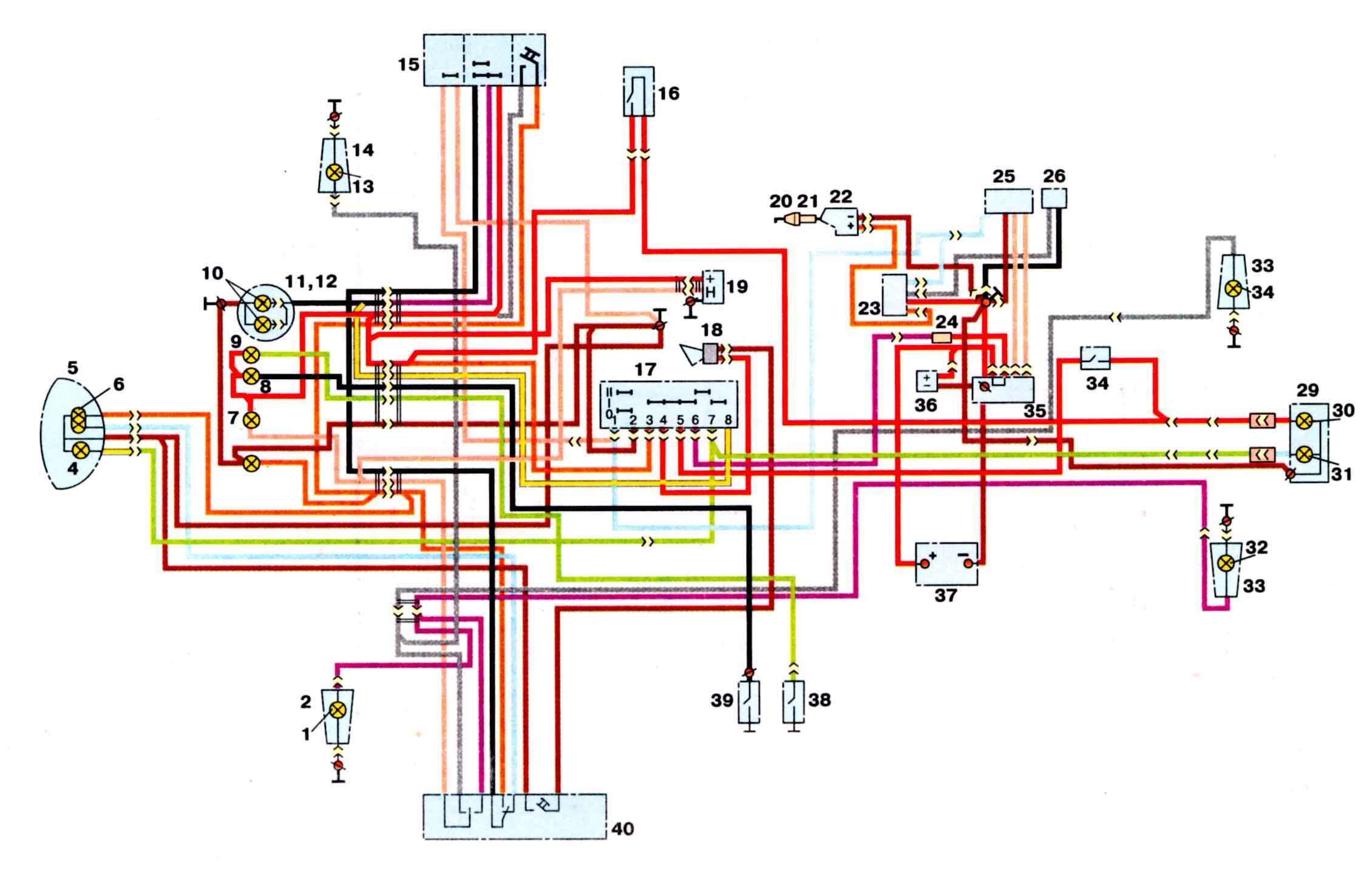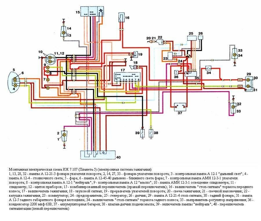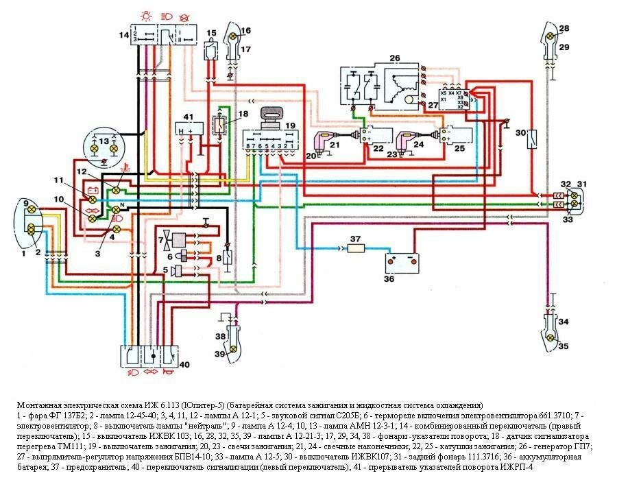 1 - фара ФГ 137Б2; 2 - лампа 12-45-40; 3, 4, 11, 12 - лампы А 12-1; 5 - звуковой сигнал С205Б; 6 - термореле включения электровентилятора 661.3710; 7 - электровентилятор; 8 - выключатель лампы "нейтраль"; 9 - лампа А 12-4; 10, 13 - лампа АМН 12-3-1; 14 - комбинированный переключатель (правый переключатель); 15 - выключатель ИЖВК 103; 16, 28, 32, 35, 39 - лампы А 12-21-3; 17, 29, 34, 38 - фонари -указатели поворота; 18 - датчик сигнализатора перегрева ТМ111; 19 - выключатель зажигания; 20, 23 - свечи зажигания; 21, 24 - свечные наконечники; 22, 25 - катушки зажигания; 26 - генератор ГП7; 27 - выпрямитель-регулятор напряжения БПВ14-10; 33 - лампа А 12-5; 30 - выключатель ИЖВК107; 31 - задний фонарь 111.3716; 36 - аккумуляторная батарея; 37 - предохранитель; 40 - переключатель сигнализации (левый переключатель); 41 - прерыватель указателей поворота.