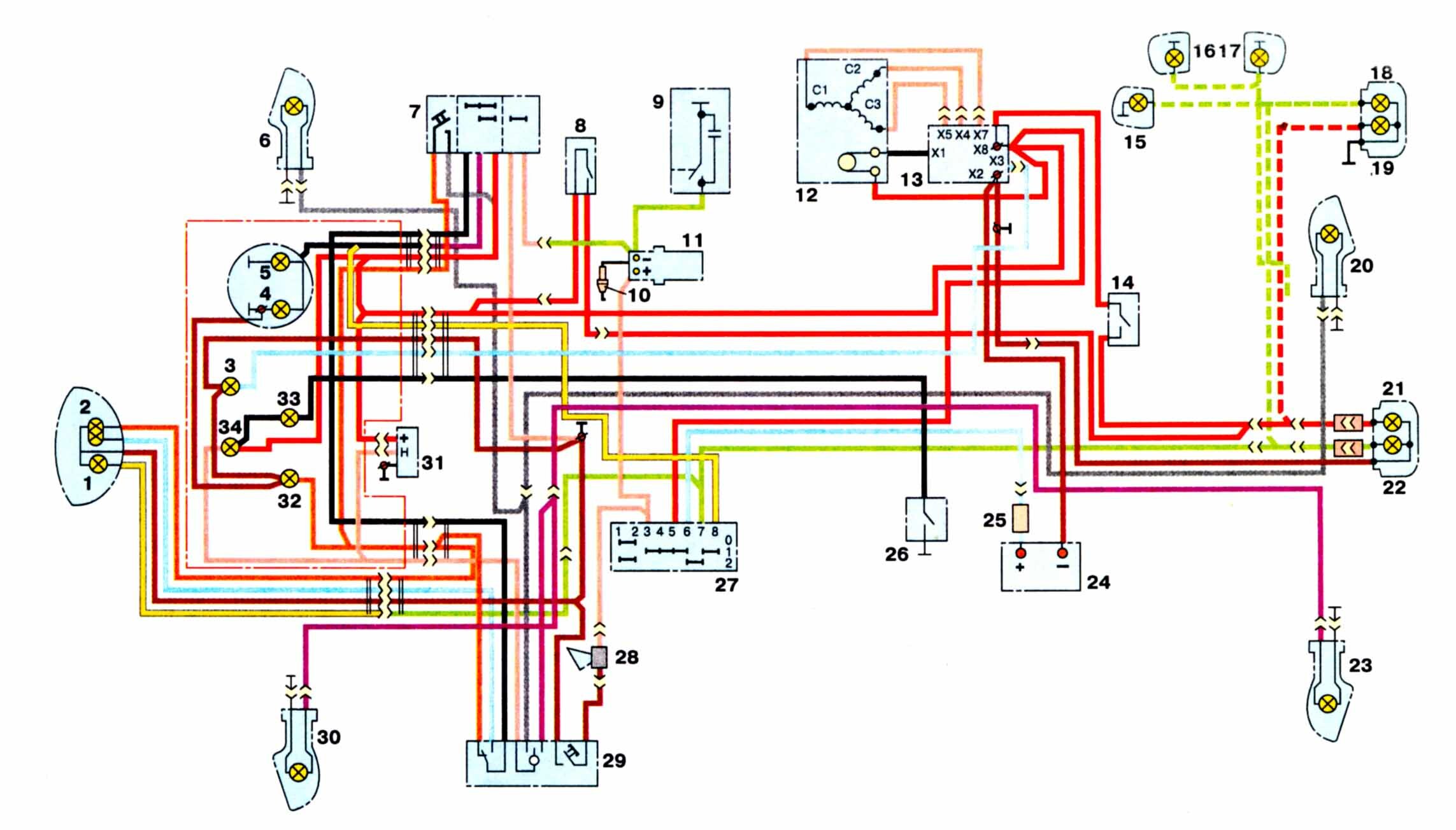 1 - лампа стояночного света - А 12-4; 2 - лампа дальнего - ближнего света фары - А 12-45:40; 3 - контрольная лампа работы генератора - А 12-1; 4, 5 - лампы подсветки шкалы спидометра - АМН 12-3; 6, 16, 17, 20, 23, 30 - лампы фонарей-указателей поворота мотоцикла и бокового прицепа; 7 - комбинированный переключатель (правый переключатель); 8 - выключатель "стоп-сигнала" тормоза переднего колеса; 9 - прерыватель; 10 - свеча зажигания; 11 - катушка зажигания; 12 - генератор; 13 - выпрямитель-регулятор напряжения БПВ14-10; 14 - выключатель "стоп-сигнала" тормоза колеса; 15, 19 - лампы габарита бокового прицепа - А 12-5; 18 - лампа стоп-сигнала бокового прицепа - А 12-21-3; 21 - лампа стоп-сигнала мотоцикла - А 12- 21-3; 22 - лампа заднего габаритного фонаря мотоцикла - А 12-5; 24 - аккумуляторная батарея; 25 - предохранитель; 26 - включатель лампы "нейтрали"; 27 - выключатель зажигания; 28 - звуковой сигнал; 29 - переключатель сигнализации (левый переключатель); 31 - прерыватель указателей поворота; 32 - контрольная лампа дальнего света фары - А 12-1; 32 - контрольная лампа "нейтраль" - А 12-1; 33 - контрольная лампа фонарей-указателей поворота - АМН 12-3;