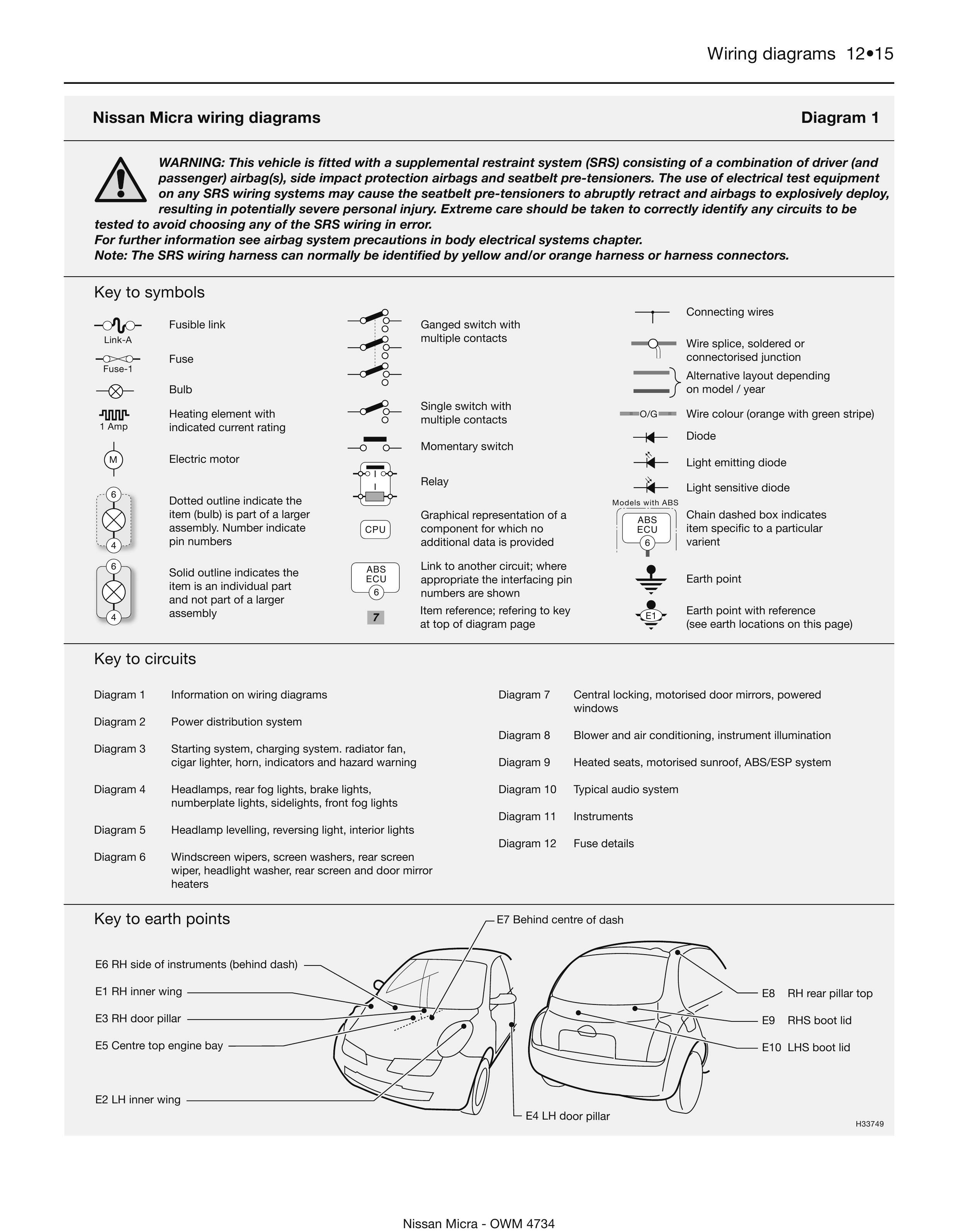Электрическая система рассматриваемых в данной статье схем автомобия Nissan Micra, работает с напряжением 12 В. Соединение массы проходит через отрицательную клемму батареи. Батарея помещается в переднем левом углу двигательного отсека. Для запуска двигателя используется стартер, выключатель стартера является составной частью замка зажигания и предназначен для возбуждения установленного на стартере тягового реле. Встроенный в панель приборов индикатор заряда указывает на исправную работу электрооборудования, пока заряд батареи в норме. Принципиальные схемы в хорошем качестве и высокой чёткостью, но на английском языке. Дополнительная информация по электрооборудованию Ниссан Микра находится тут.