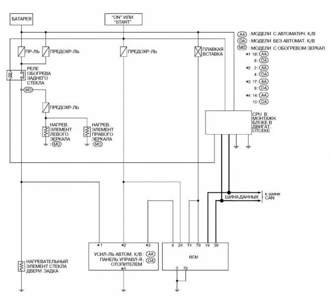 Электросхема обогрева заднего стекла и наружных зеркал заднего вида