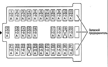 30. система управления накалом, чек энджин и разъём OBD-2, датчик скорости, ABS, ESP, подушки безопасности, система зарядки, датчик света, спидометр, тахометр, указатели температуры, уровня масла и топлива, сигнальные лампы, подсветка, NATS, индикатор АКПП, навигация, кондей, поворотники и аварийка, фонарь заднего хода, выключатель парковка/нейтраль, система управления камерой заднего вида.