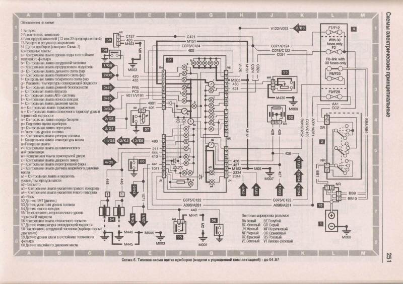 Указана батарея, выключатель зажигания, блоки предохранителей, контрольные лампы уровней и другие элементы схемы.