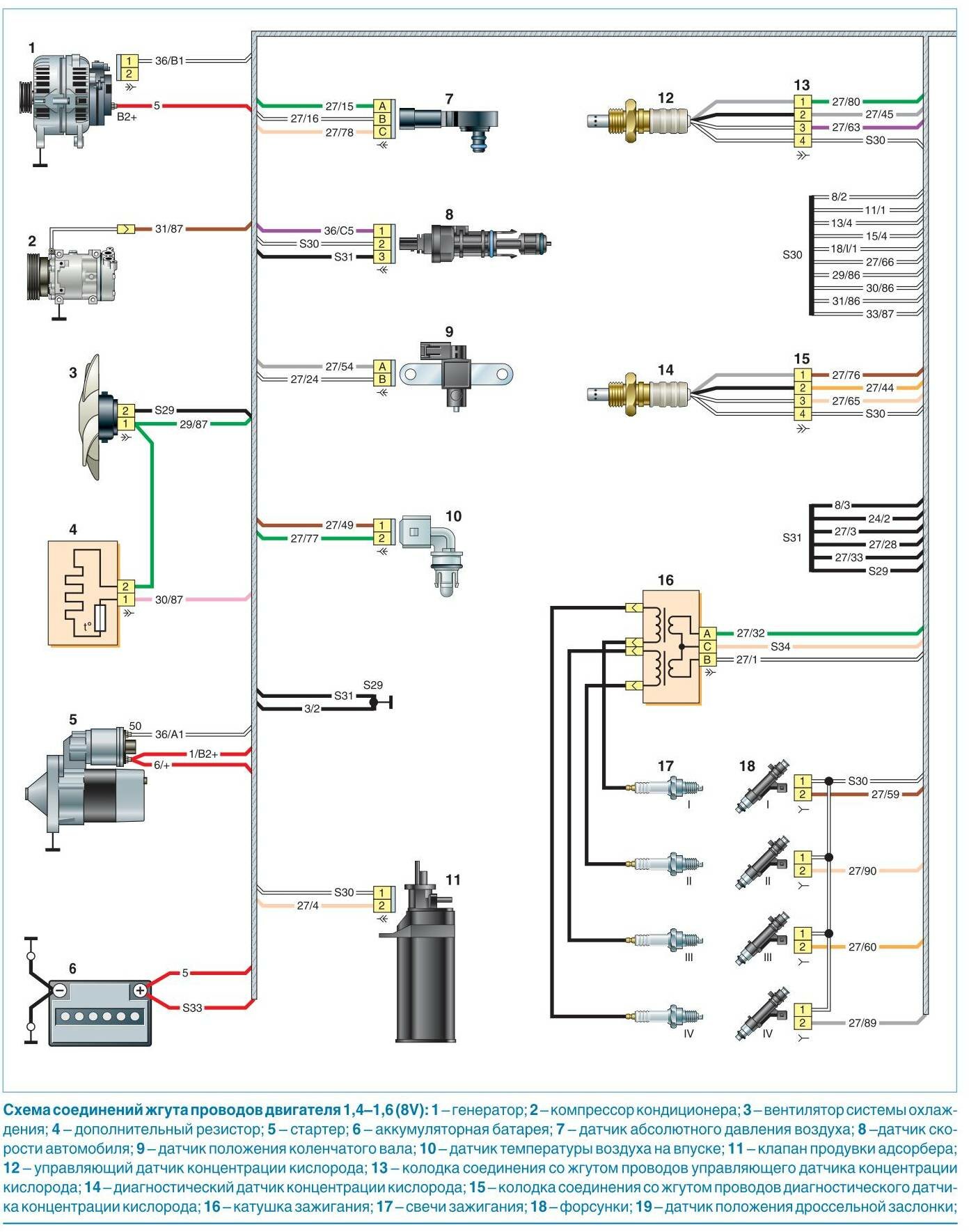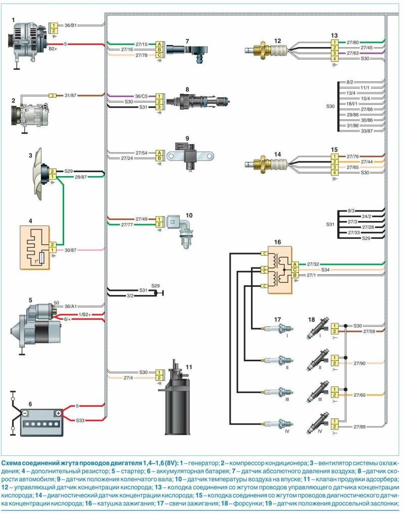 Схема соединений жгута проводов Renault Sandero двигателя 1,6 16V