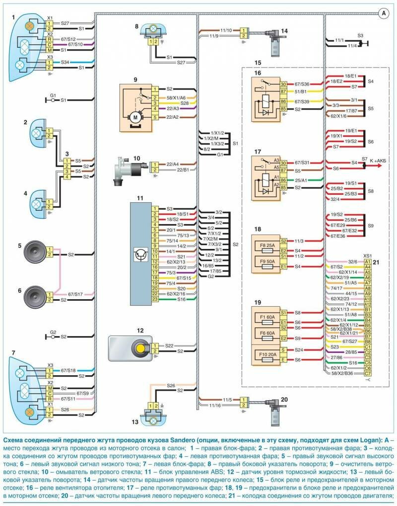 Цветные элетросхемы для Renault Sandero. На автомобили устанавливают двигатели рабочим объемом 1,4 и 1,6 л. Внешне двигатели идентичны и отличаются лишь радиусом кривошипа коленчатого вала и высотой блока цилиндров. Коробка передач пятиступенчатая механическая. Коробки передач, устанавливаемые на автомобили с двигателями рабочим объемом 1,4 и 1,6 л, практически одинаковы по конструкции, имеют одинаковые передаточные числа и различаются только размерами картера сцепления, что обусловлено применением на этих двигателях сцеплений разного диаметра. Каждый элемент схемы содержит подробный перечень компонентов соответствующего узла электрооборудования Рено Сандеро.