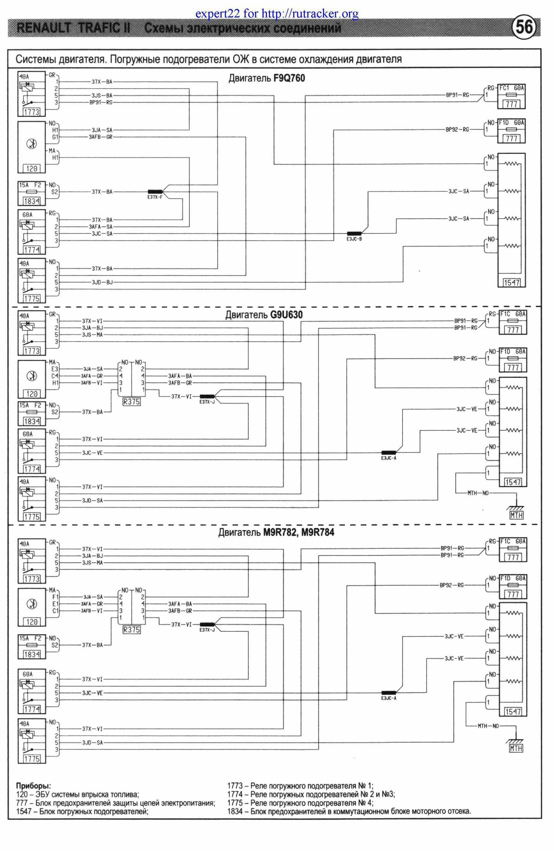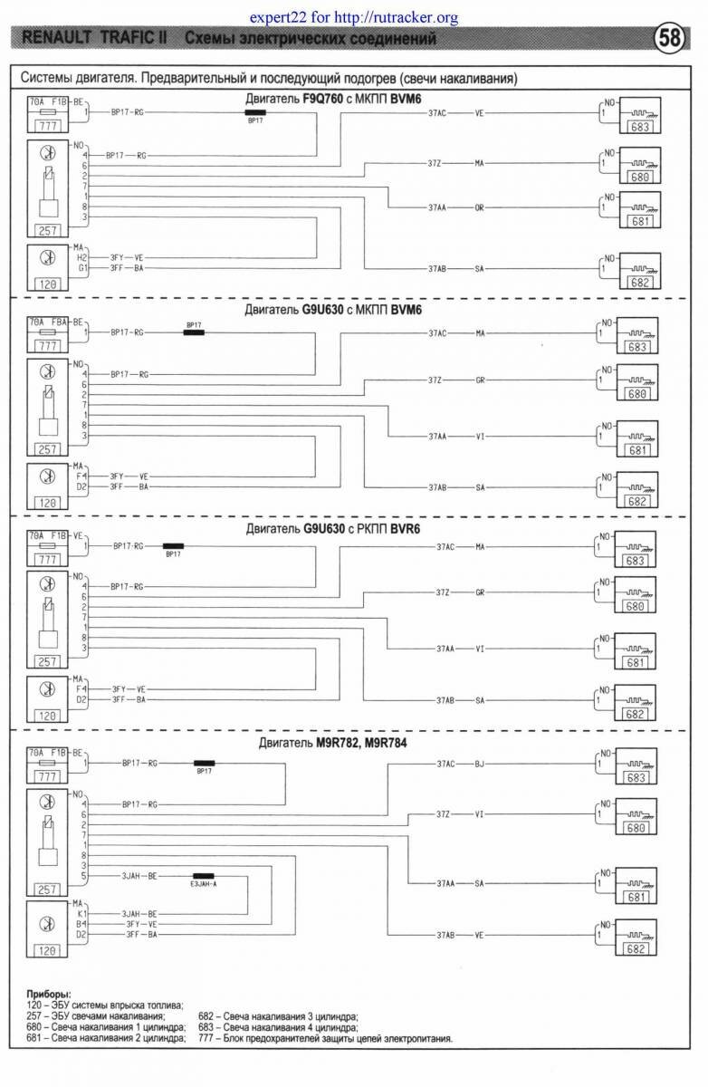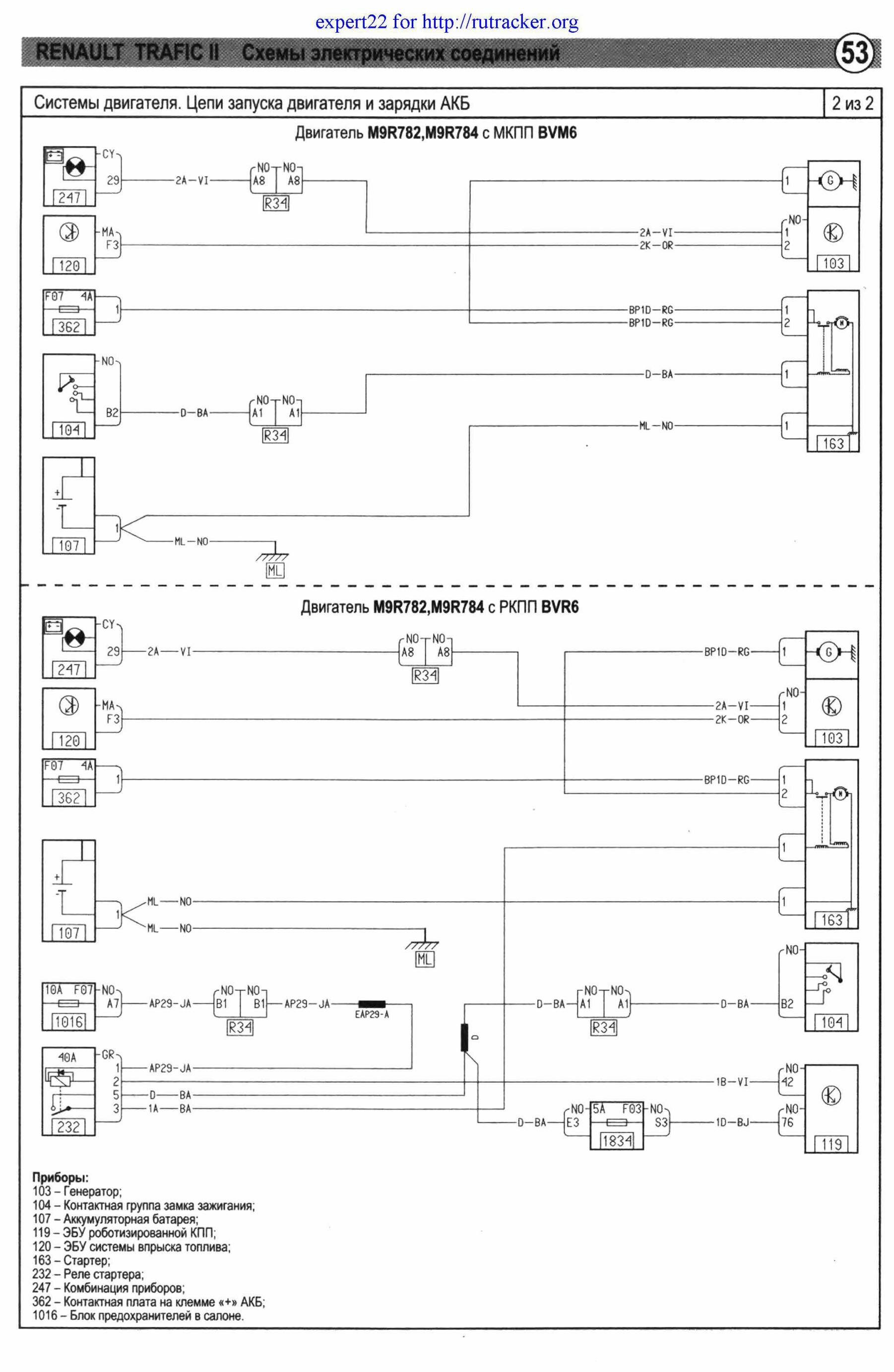 Бесплатные схемы электрооборудования двигателя автомобиля Renault Trafic. Все схемы на русском языке и в хорошем качестве. Чтоб развернуть картинку на весь экран - кликните на неё. Приведены модули запуска двигателя, впрыска топлива, охлаждения, электроснабжения двигателя. Схемы защищены от копирования и просматривать их можно только на сайте. Продолжение сборника, с описание остальных схем Renault Trafic, смотрите тут.