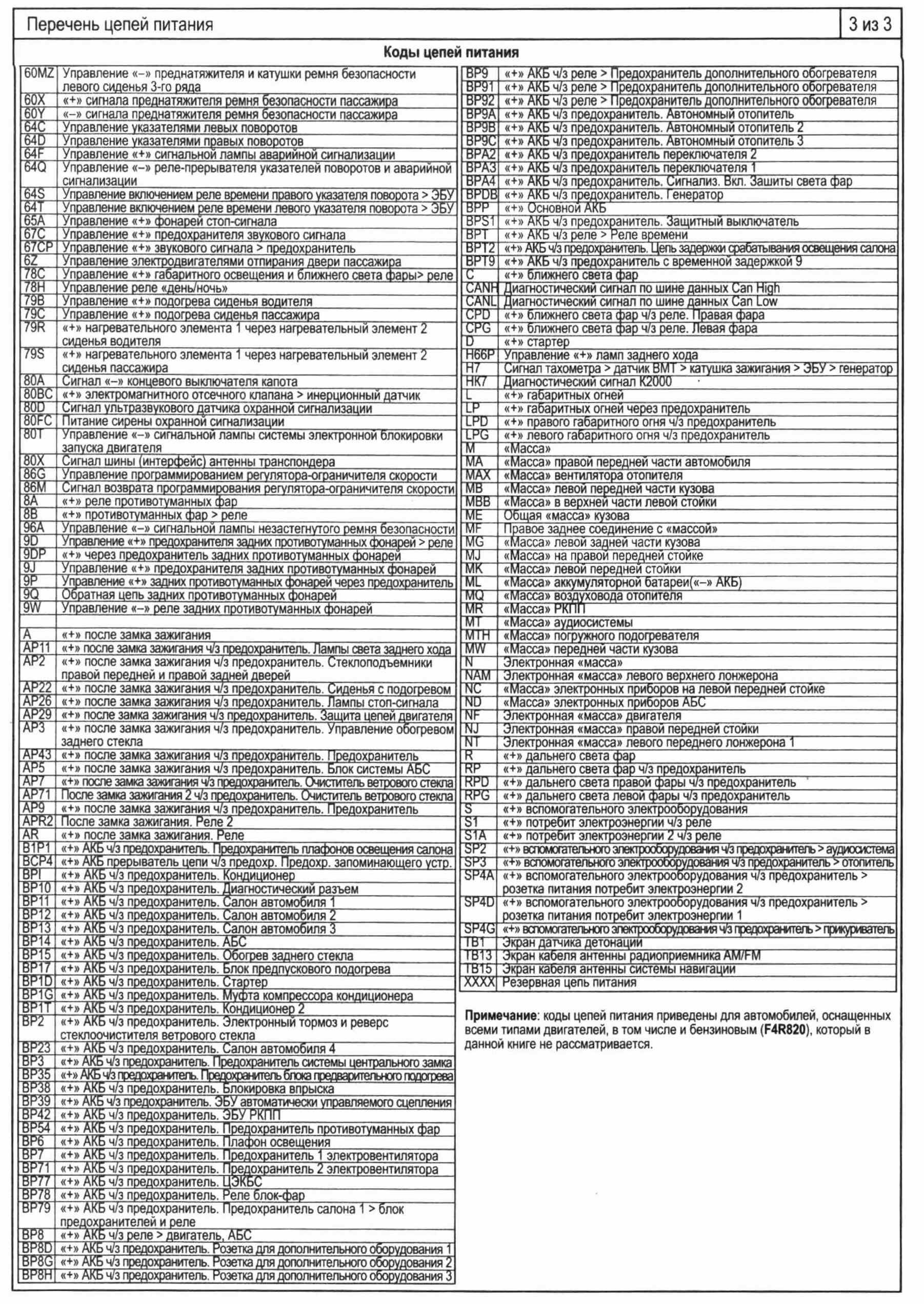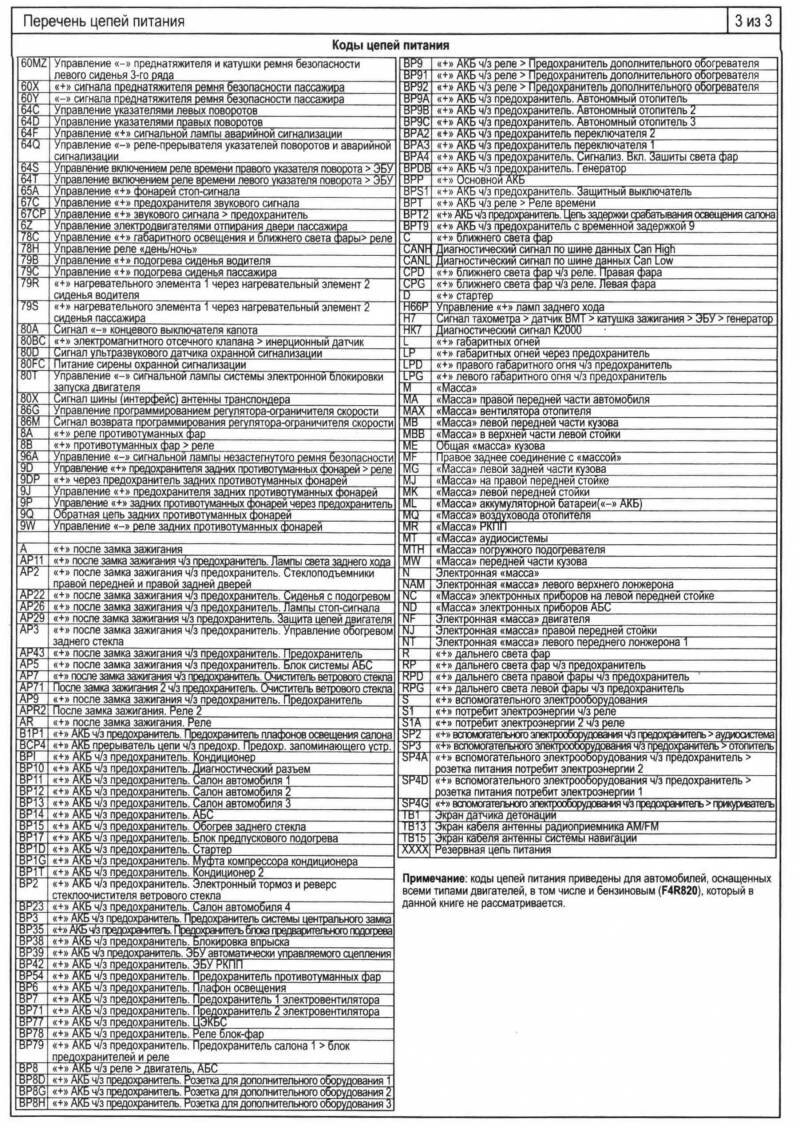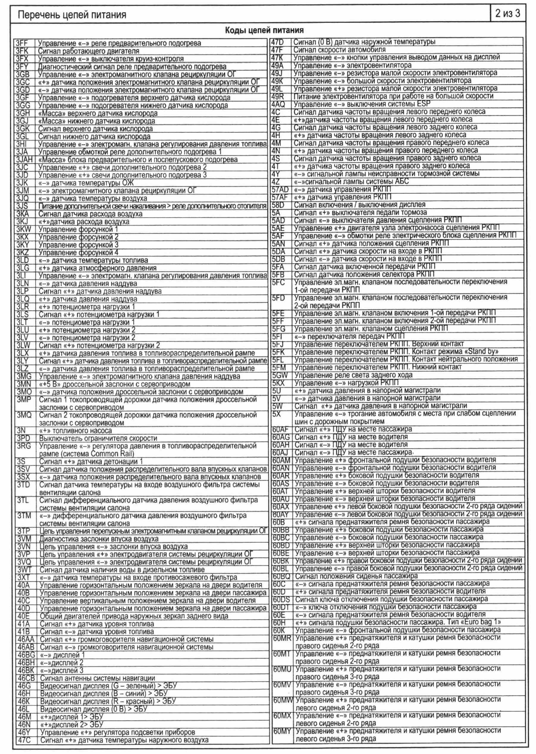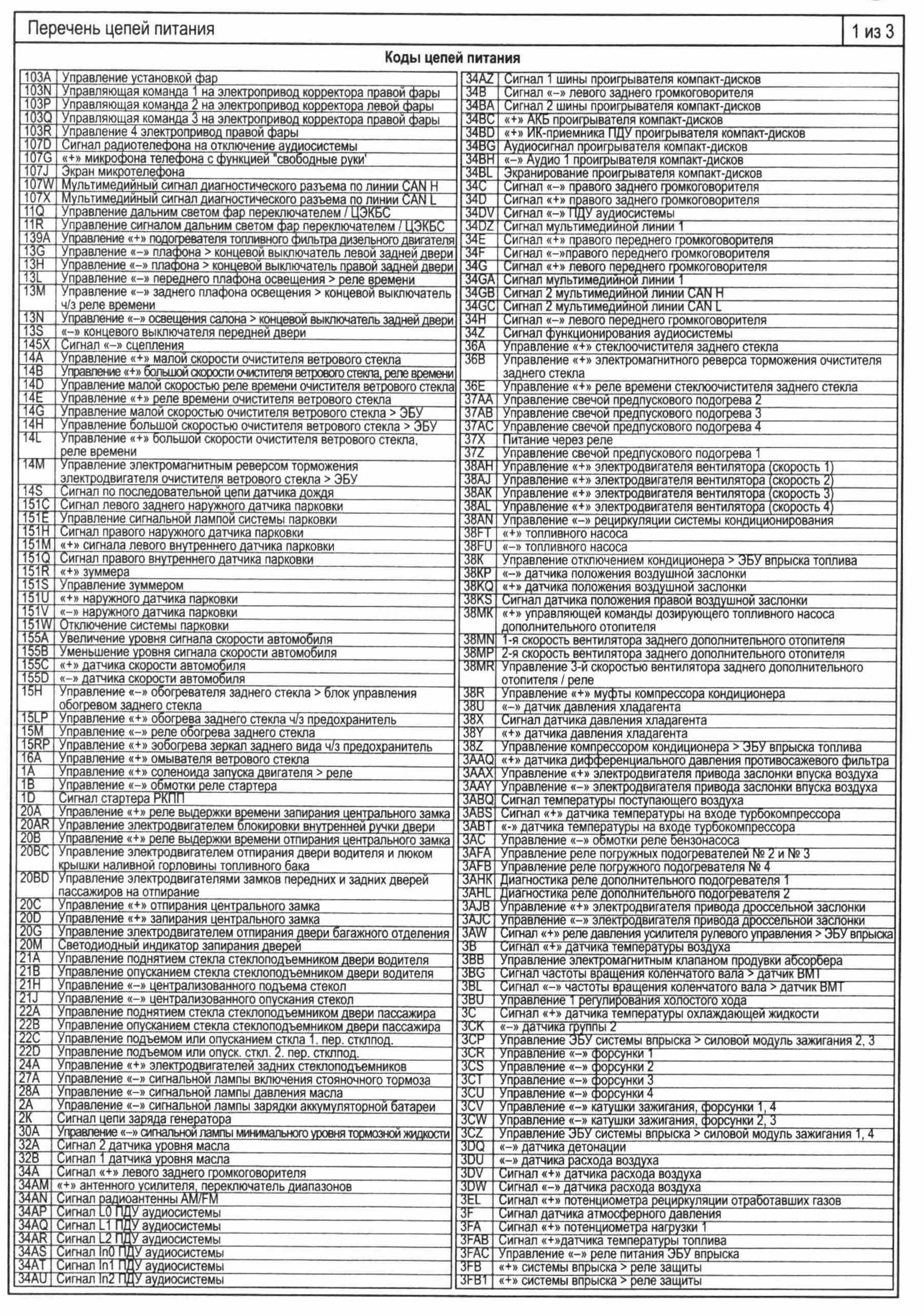 Коды цепей питания - таблица