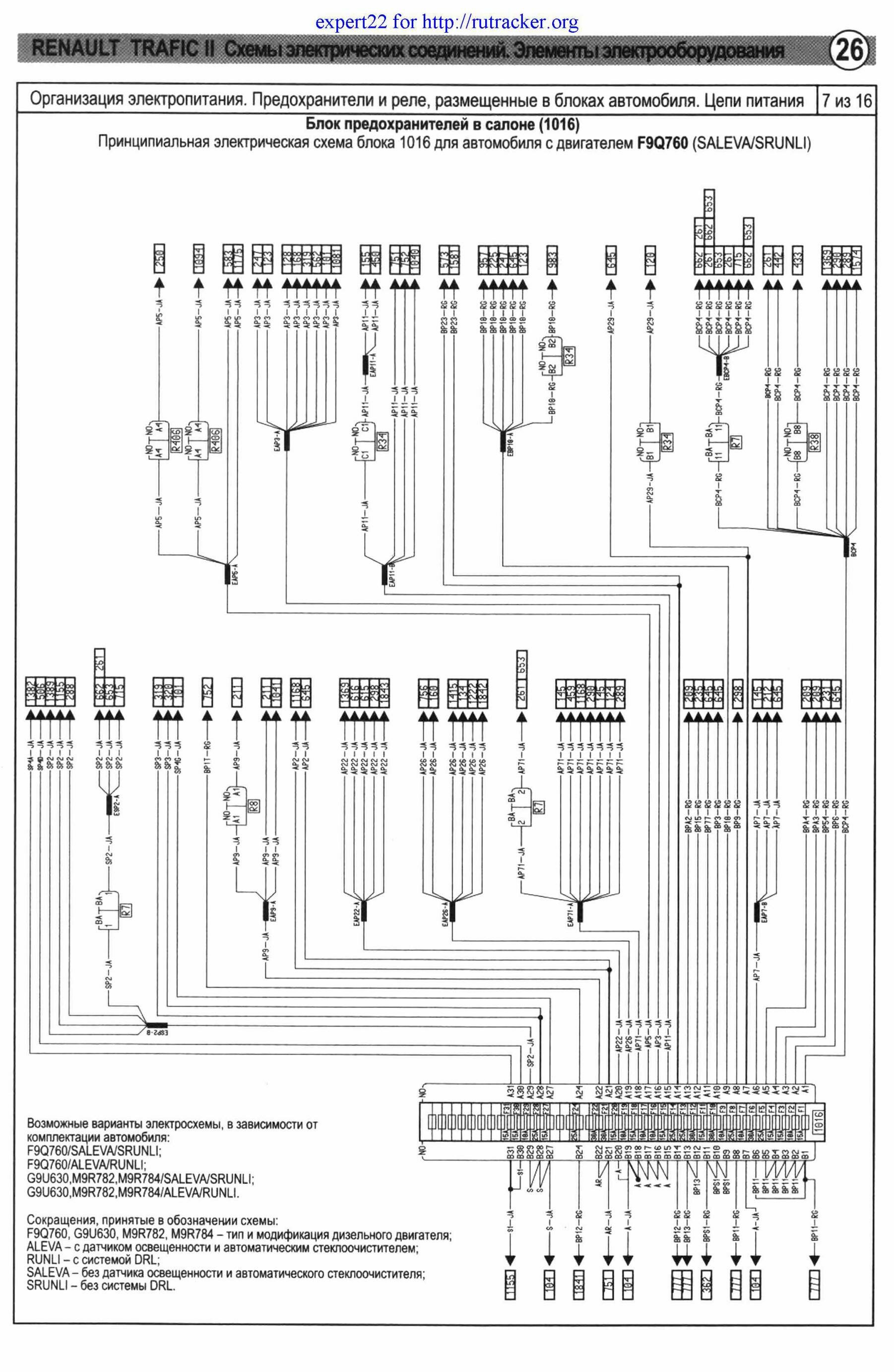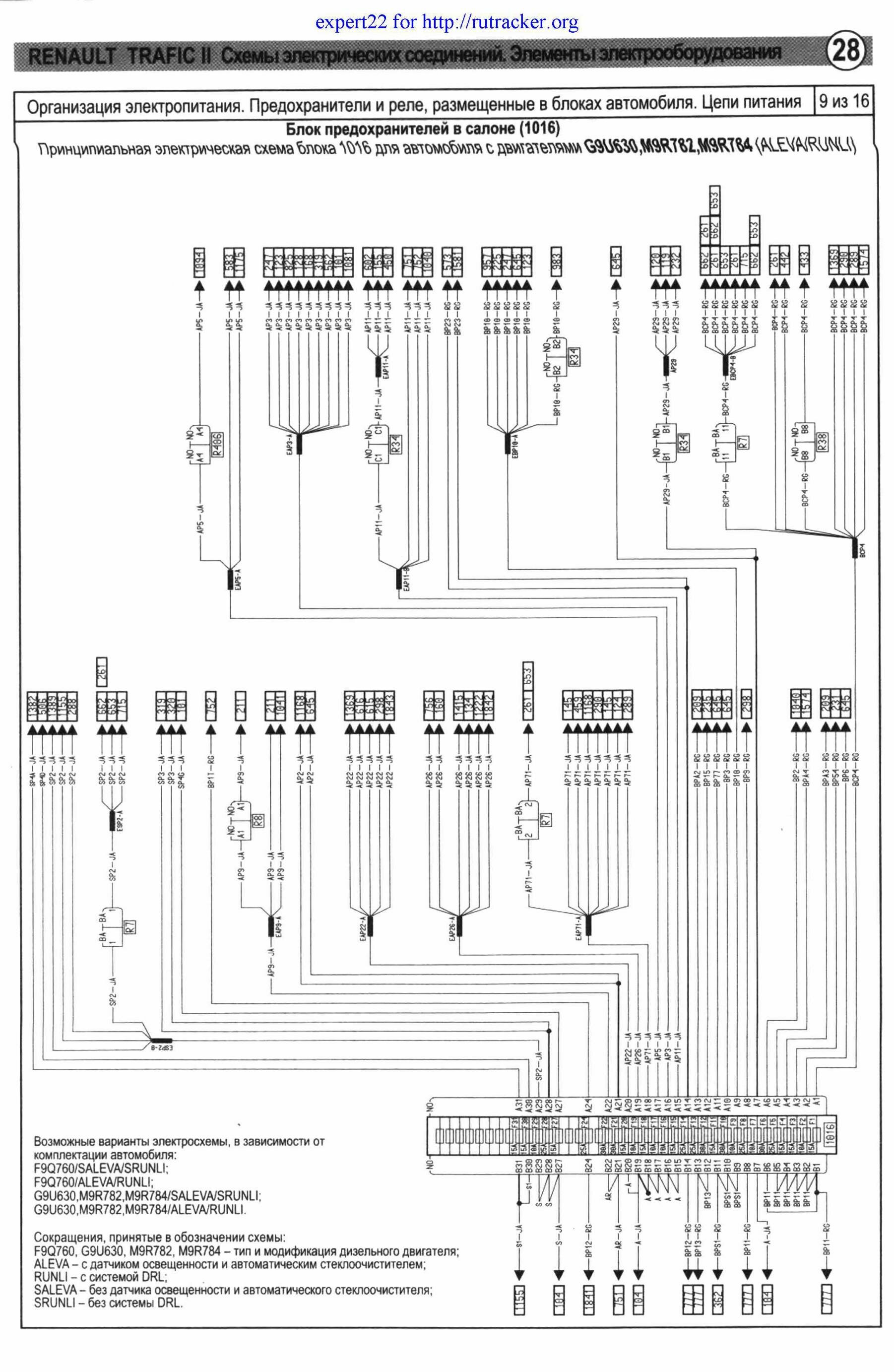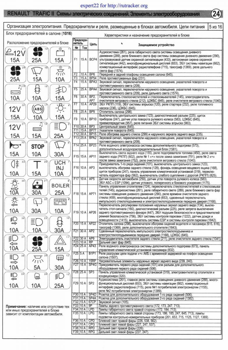 Принципиальные схемы электрооборудования автомобиля Renault Trafic - предохранители и реле с их обозначениями и номиналами. Все схемы на русском языке и в хорошем качестве. Чтоб развернуть картинку на весь экран - кликните на неё. Приведены назначения и местоположениях всех предохранителей, показаны защищаемые цепи. Указаны их условные обозначения на корпусе. Схемы защищены от копирования и просматривать их можно только на сайте. Продолжение сборника, с описание остальных схем Renault Trafic.