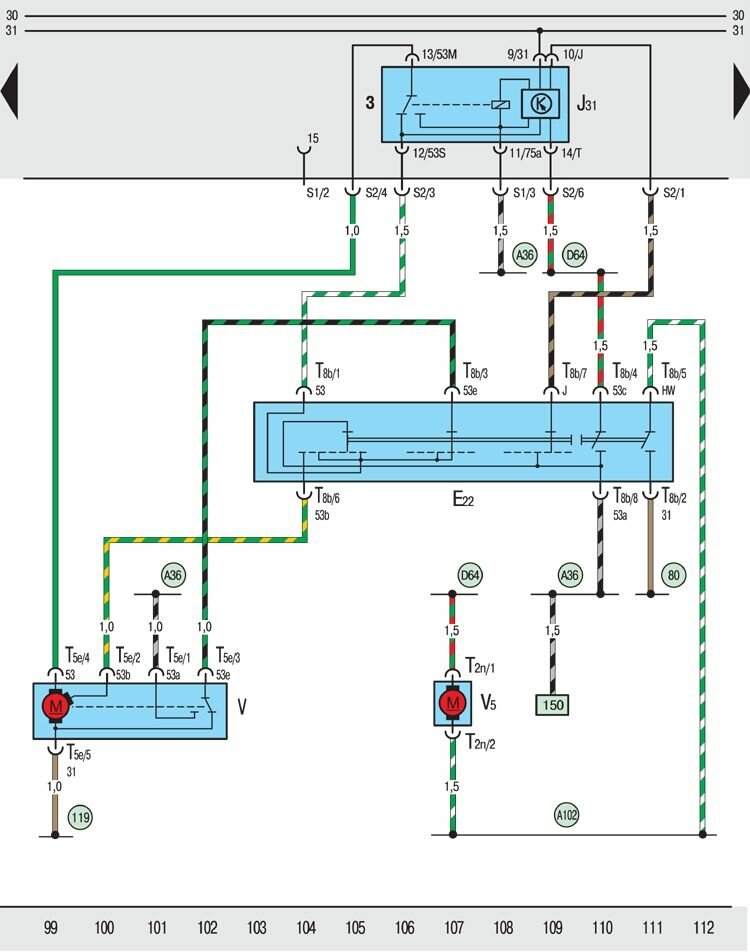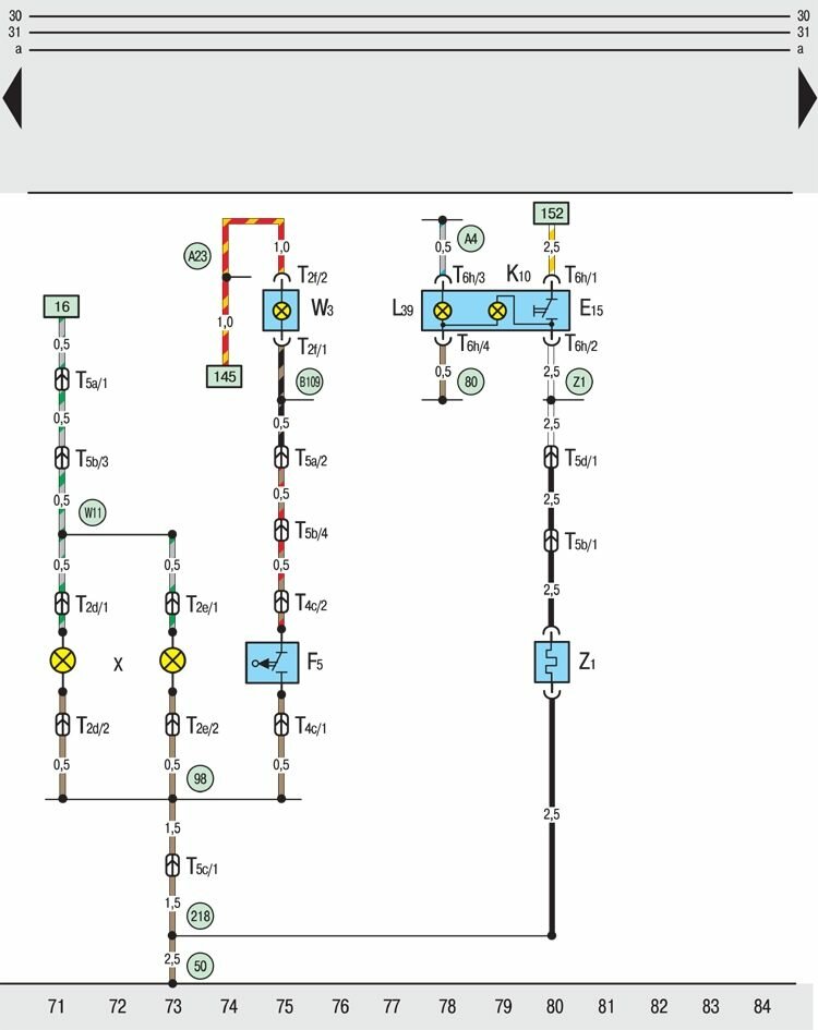 T5e – пятиконтактный штекерный разъем, на электродвигателе стеклоочистителей;