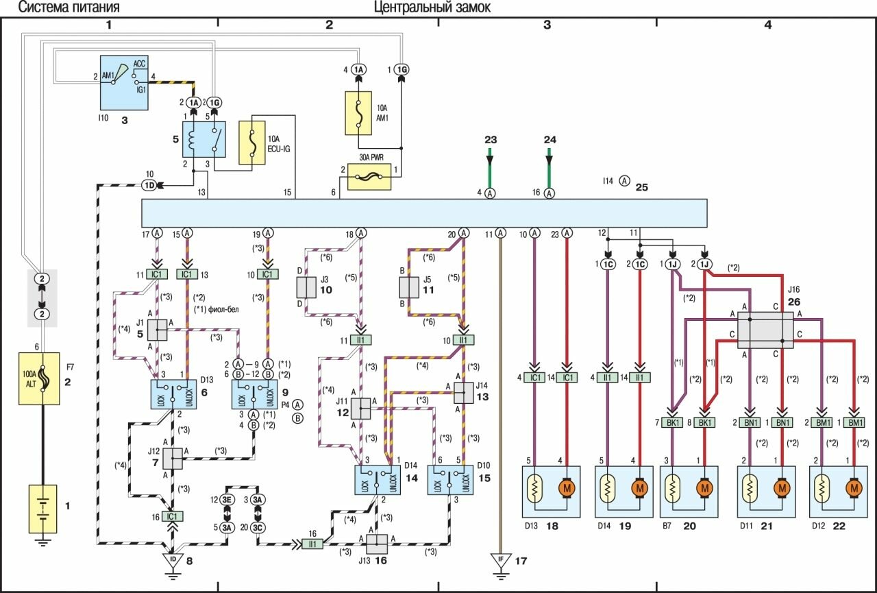 Электросхемы автомобиля Toyota Rav4. Все схемы в высоком качеств и цвете. Скачать электросхемы можно кликнув на кртинке и увеличив её. В этой первой части показаны такие модули авто: система питания, управления двигателем, схема зарядки и климат контроля. Другие узлы электрооборудования Toyota Rav4 показаны тут. Для защиты электрических цепей используются предохранители с ножевыми контактами, цвет которых соответствует току защиты предохранителя. Исправность предохранителя определяют по наличию проволочного проводника, соединяющего контакты предохранителя. Для замены вышедшего из строя предохранителя предварительно выключите соответствующую электрическую цепь, извлеките предохранитель из гнезда пинцетом. Если вновь установленный предохранитель мгновенно выходит из строя при подаче напряжения, проверьте защищаемую электрическую цепь. Если предохранитель защищает несколько цепей, подключите их поочередно, чтобы по перегоранию предохранителя определить неисправную цепь. Аккумуляторная батарея расположена в правом заднем углу моторного отсека. Для снятия аккумуляторной батареи предварительно снимите капот. Работать с АКБ необходимо в защитных очках. Ни в коем случае не допускайте попадания капель кислоты и частиц, содержащих соединения свинца, в глаза, на кожу или на одежду. При зарядке аккумуляторных батарей выделяется взрывоопасная смесь газов. При работе с проводами и электрическими приборами запрещено пользование огнем, искрящими устройствами, открытыми пожароопасными световыми приборами и курение. Избегайте возникновения искрения при обращении с проводами и электрическими устройствами. Перед проведением любых работ по системе электрооборудования автомобиля отсоединяйте «минусовый» провод от аккумуляторной батареи.