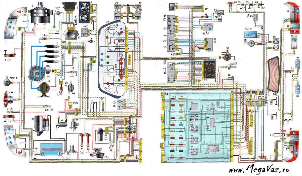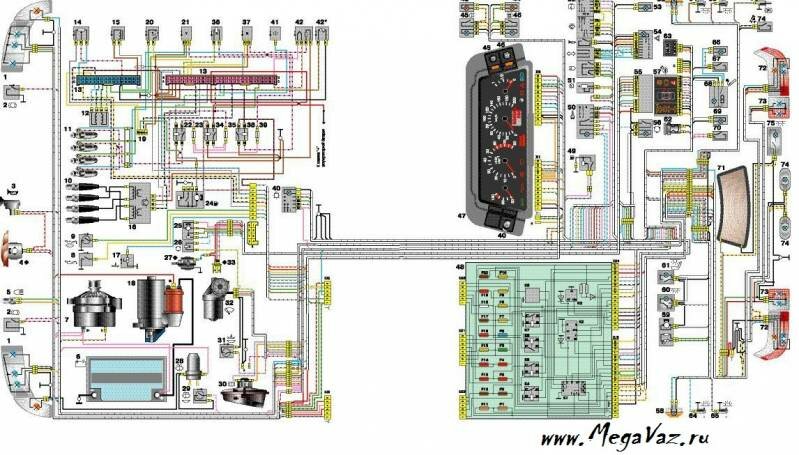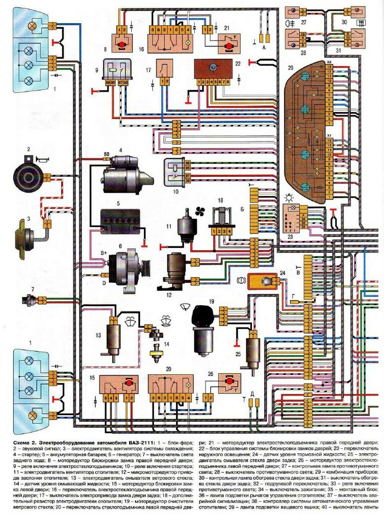1. блок-фара; 2. датчики износа передних тормозных колодок; 3. датчик включения электродвигателя вентилятора; 4. электродвигатель вентилятора системы охлаждения двигателя; 5. звуковой сигнал; 6. генератор: 7. датчик уровня масла; 8. блок управления электромагнитным клапаном карбюратора; 9. контроллер отопителя; 10. выключатель клапана рециркуляции; 11. лампа подсветки рычагов управления отопителем; 12. коммутатор; 13. концевой выключатель карбюратора; 14. датчик контрольной лампы давления масла; 15. свечи зажигания; 16. электромагнитный клапан карбюратора; 17. датчик указателя температуры охлаждающей жидкости; 18. датчик-распределитель зажигания; 19. катушка зажигания; 20. стартер ВАЗ-2111; 21. электродвигатель вентилятора отопителя; 22. дополнительный резистор электродвигателя отопителя; 23. датчик скорости; 24. выключатель света заднего хода; 25. микромоторедуктор привода заслонки отопителя; 26. клапан рециркуляции; 27. датчик уровня тормозной жидкости; 28. колодки для подключения электродвигателя омывателя заднего стекла; 29. аккумуляторная батарея; 30. электродвигатель смывателя ветрового стекла; 31. датчик уровня омывающей жидкости; 32. датчик уровня охлаждающей жидкости; 33. моторедуктор очистителя ветрового стекла; 34. монтажный блок: 35. колодки для подключения жгута предупредительного света; 36. переключатель наружного освещения; 37. комбинация приборов; 38. выключатель заднего противотуманного света; 39. контрольная лампа противотуманного света; 40. контрольная лампа обогрева заднего стекла; 41. часы; 42. выключатель обогрева заднего стекла; 43. подрулевой переключатель; 44. колодка для переключения проводов при установке блок-фар другого типа; 45. регулятор освещения приборов; 46. выключатель зажигания; 47. колодки для подключения жгута проводов очистителей фар; 48. розетка для переносной лампы; 49. плафон индивидуального освещения салона; 50. выключатель стоп-сигнала; 51. плафон освещения салона; 52. блок бортовой системы контроля; 53. датчик указателя уровня топлива; 54. выключатель аварийной сигнализации ВАЗ-2111; 55. датчик ремня безопасности водителя; 56. прикуриватель; 57. лампа подсветки пепельницы; 58. выключатель лампы освещения вещевого ящика; 59. колодка для подключения бортового компьютера; 60. лампа освещения вещевого ящика; 61. боковые указатели поворота; 62. выключатели в стойках передних дверей; 63. выключатели в стойках задних дверей; 64. выключатель контрольной лампы стояночного тормоза; 65. фонарь освещения багажника; 66. датчик температуры для системы отопления; 67. наружные задние фонари; 68. внутренние задние фонари; 69. фонари освещения номерного знака; 70. элемент обогрева заднего стекла; 71. колодка для подключения дополнительного стоп-сигнала ВАЗ 2111.