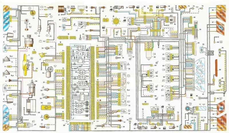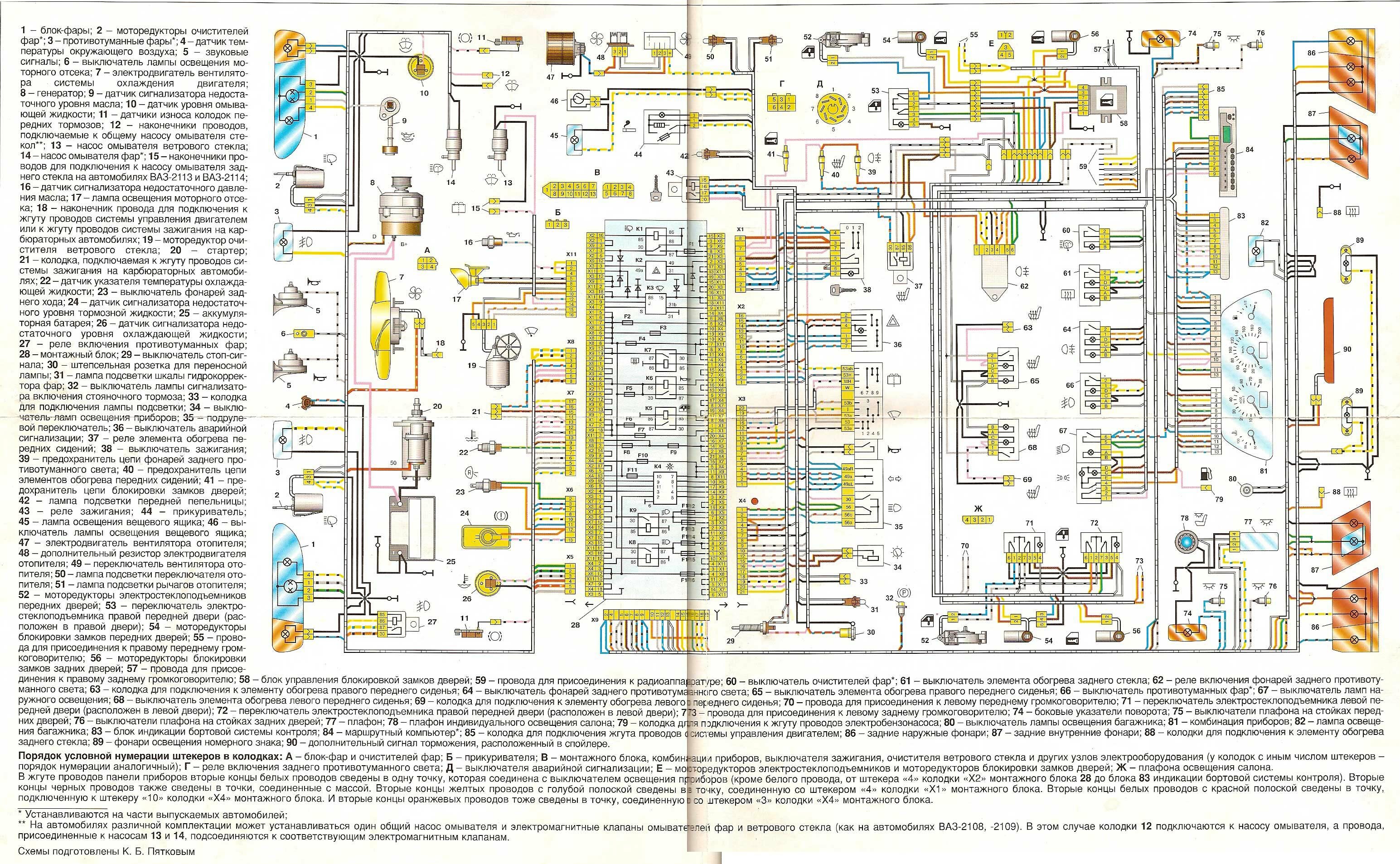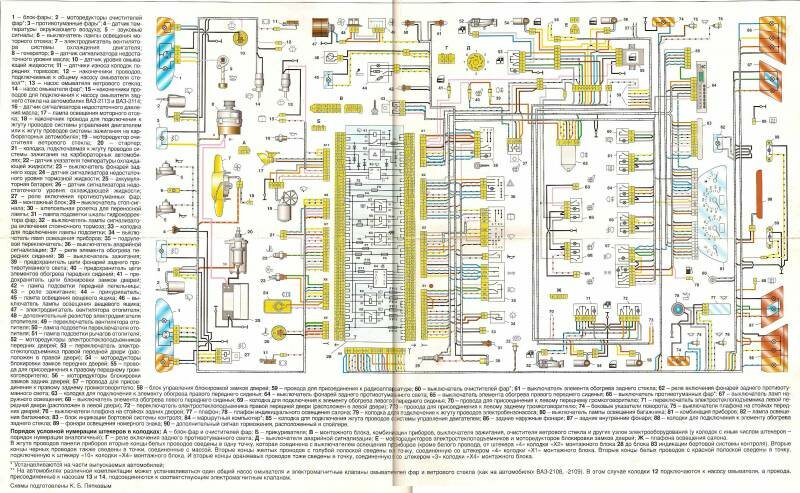 1 - блок-фары; 2 - моторедукторы очистителей фар*; 3 - противотуманные фары* ваз 2115; 4 - датчик температуры окружающего воздуха; 5 - звуковые сигналы; 6 - выключатель лампы освещения моторного отсека; 7 - электродвигатель вентилятора системы охлаждения двигателя; 8 - генератор; 9 - датчик сигнализатора недостаточного уровня масла; 10 - датчик уровня омывающей жидкости; 11 - датчики износа колодок передних тормозов; 12 - наконечники проводов, подключаемые к общему насосу омывателя стекол**; 13 - насос омывателя ветрового стекла; 14 - насос омывателя фар*; 15 - наконечники проводов для подключения к насосу омывателя заднего стекла на автомобилях ВАЗ-2113 и ВАЗ-2114; 16 - датчик сигнализатора недостаточного давления масла; 17-лампа освещения моторного отсека; 18 - наконечник провода для подключения к жгуту проводов системы управления двигателем или к жгуту проводов системы зажигания на карбюраторных автомобилях; 19 - моторедуктор очистителя ветрового стекла; 20 - стартер: 21 - колодка, подключаемая к жгуту проводов системы зажигания на карбюраторных автомобилях; 22 - датчик указателя температуры охлаждающей жидкости; 23 - выключатель фонарей заднего хода; 24 - датчик сигнализатора недостаточного уровня тормозной жидкости; 25 - аккумуляторная батарея; 26 - датчик сигнализатора недостаточного уровня охлаждающей жидкости; 27 - реле включения противотуманных фар; 28 - монтажный блок; 29 - выключатель стоп-сигнала; 30 - штепсельная розетка для переносной лампы; 31 - лампа подсветки шкалы гидрокорректора фар; 32 - выключатель лампы сигнализатора включения стояночного тормоза; 33 - колодка для подключения лампы подсветки; 34 - выключатель-ламп освещения приборов; 35 - подрулевой переключатель; 36 - выключатель аварийной сигнализации; 37 - реле элемента обогрева передних сидений; 38 - выключатель зажигания; 39 - предохранитель цепи фонарей заднего про-тивотуманного света; 40 - предохранитель цепи элементов обогрева передних сидений; 41 - предохранитель цепи блокировки замков дверей; 42 - лампа подсветки передней пепельницы; 43 - реле зажигания; 44 - прикуриватель ваз-2115; 45 - лампа освещения вещевого ящика; 46 - выключатель лампы освещения вещевого ящика; 47 - электродвигатель вентилятора отопителя; 48 - дополнительный резистор электродвигателя отопителя; 49 - переключатель вентилятора отопителя; 50 - лампа подсветки переключателя отопителя; 51 - лампа подсветки рычагов отопителя; 52 - моторедукторы электростеклоподъемников передних дверей; 53 - переключатель электростеклоподъемника правой передней двери (расположен в правой двери); 54 - моторедукторы блокировки замков передних дверей; 55 - провода для присоединения к правому переднему громкоговорителю; 56 - моторедукторы блокировки замков задних дверей; 57 - провода для присоединения к правому заднему громкоговорителю; 58 - блок управления блокировкой замков дверей; 59 - провода для присоединения к радиоаппаратуре; 60 - выключатель очистителей фар*; 61 - выключатель элемента обогрева заднего стекла; 62 - реле включения фонарей заднего противотуманного света; 63 - колодка для подключения к элементу обогрева правого переднего сиденья: 64 - выключатель фонарей заднего противотумаанного света: 65 - выключатель элемента обогрева правого переднего сиденья; 66 - выключатель противотуманных фар*; 67 - выключатель ламп наружного освещения; 68 - выключатель элемента обогрева лево